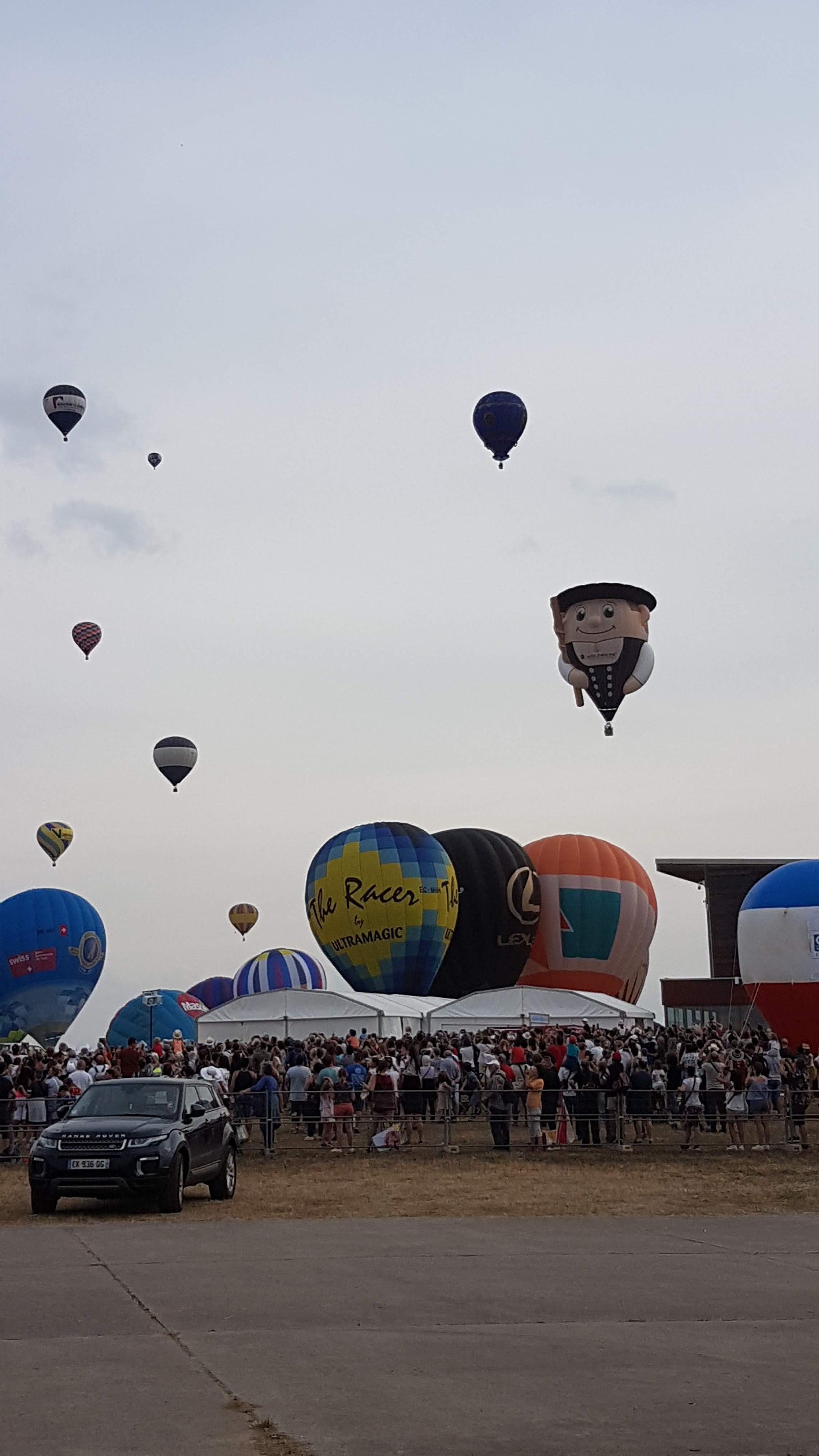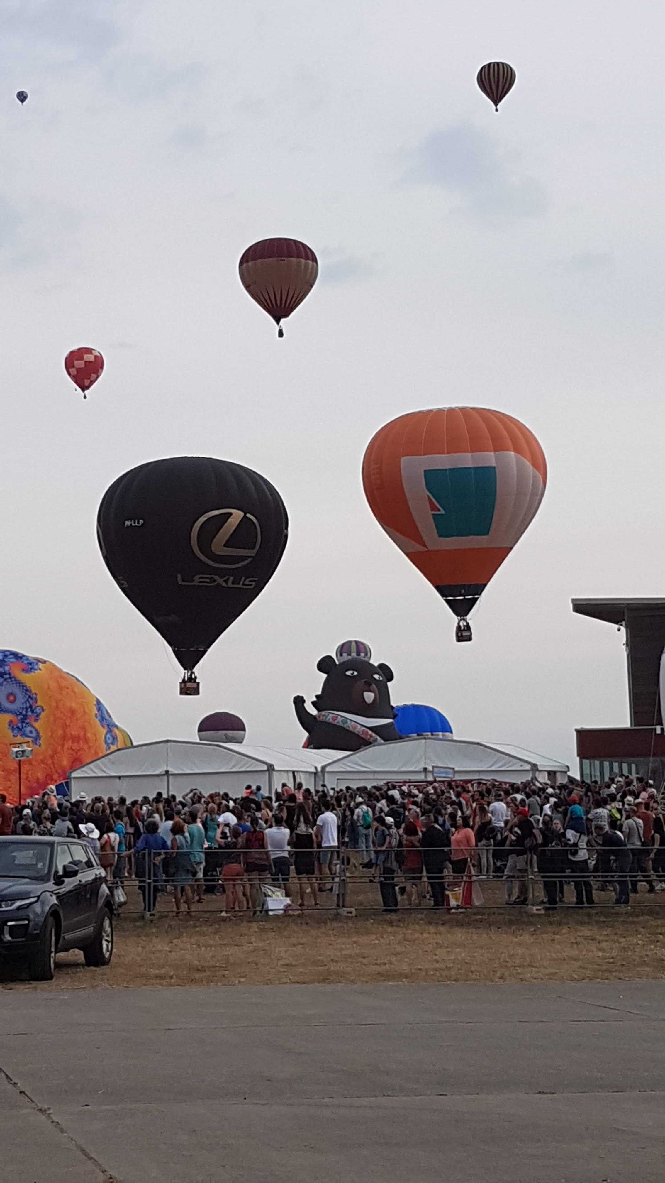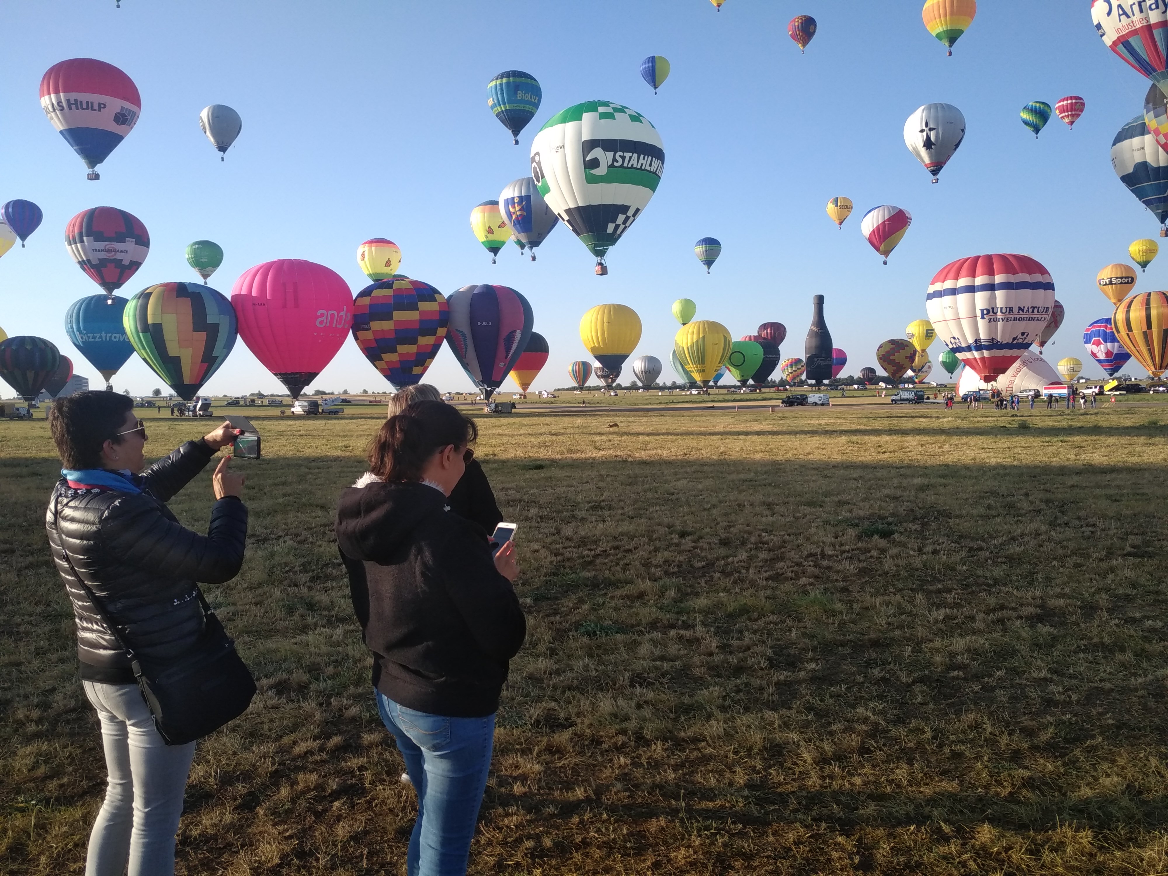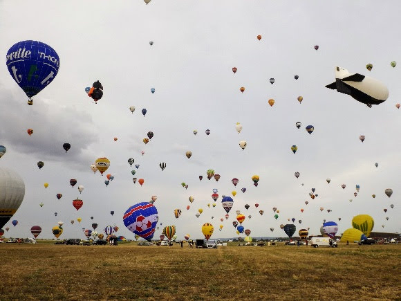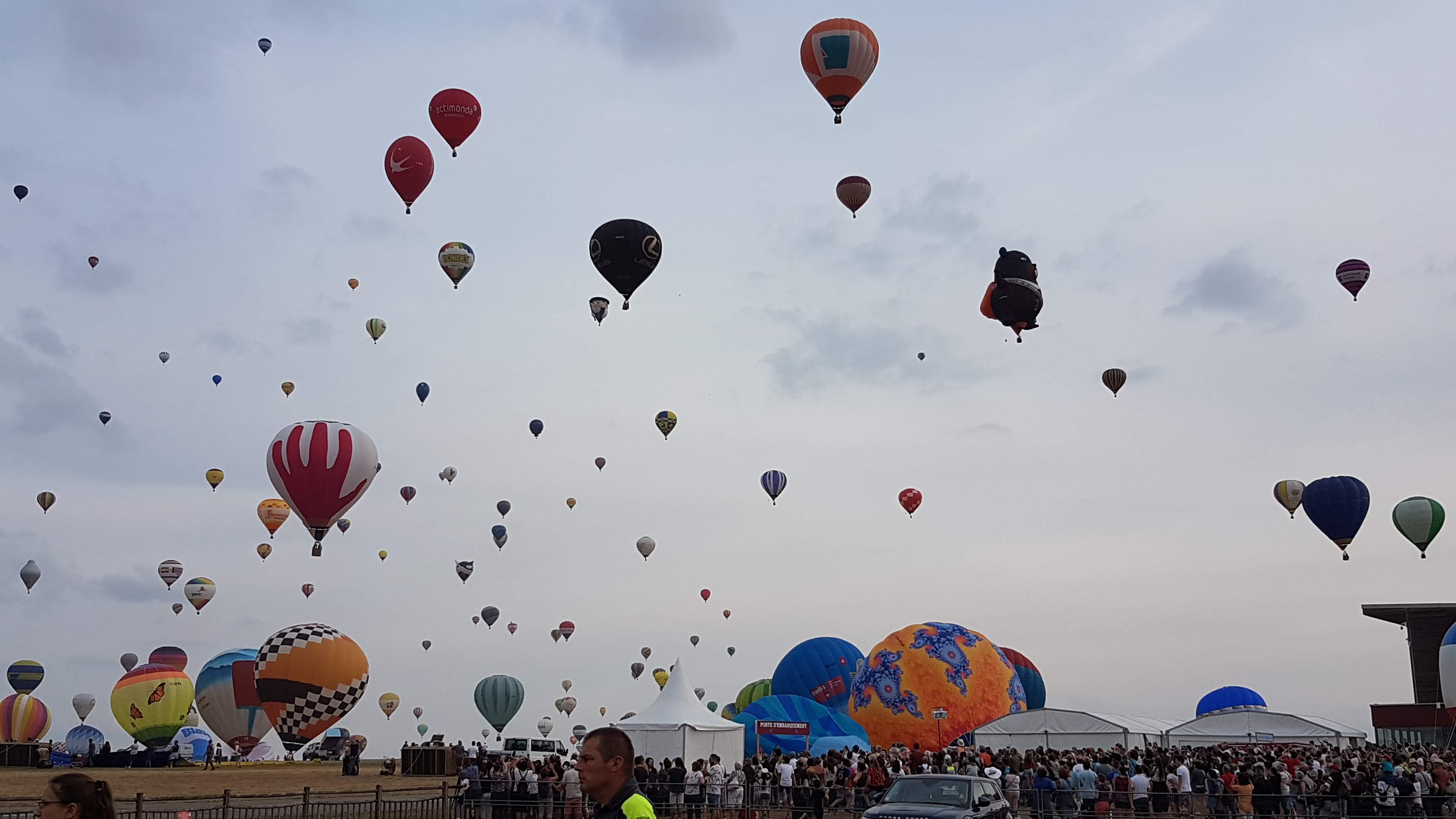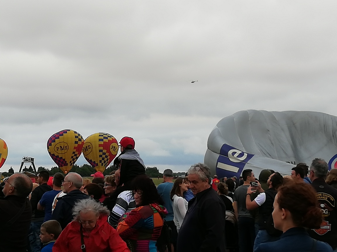 Beaucoup, beaucoup, beaucoup de monde pour aller voir un départ à 18h00. Environ 40 minutes de files de voitures pour voir l'entrée du site et se faire délester vers le parking sud par les gendarmes. Arrivé au parking sur des champs, 15 minutes de marche pour accéder à l'entrée qui lui est gratuit. Gratuit, mot qui temps à disparaître du vocabulaire Français. Le service d'ordre refuse les bouteilles de bières et autres bouteilles, mais ça passe quand même, car vérifier les sacs, les poussettes, les sacs à dos, les glacières. Pas chose facile. Reste à se placer sur les espaces encore libre devant la piste d'envol. Pas de chance, pas de départ faute à trop de vent, la foule se précipite pour sortir rapidement. Pas de chance, encore 1h00 pour sortir du parking principal. Le notre, personne, et les gendarmes sécurisés les sorties, bien. Restauration possible, wc public en nombres dispo, expo, mongolfière à doudou pour les enfants, bref, de quoi vous distraire. Merci aux organisateurs pour ce fabuleux évènement qui se tient tous les 2 ans. C'est un sacré boulot de tout prévoir, sauf la météo, là on subit.