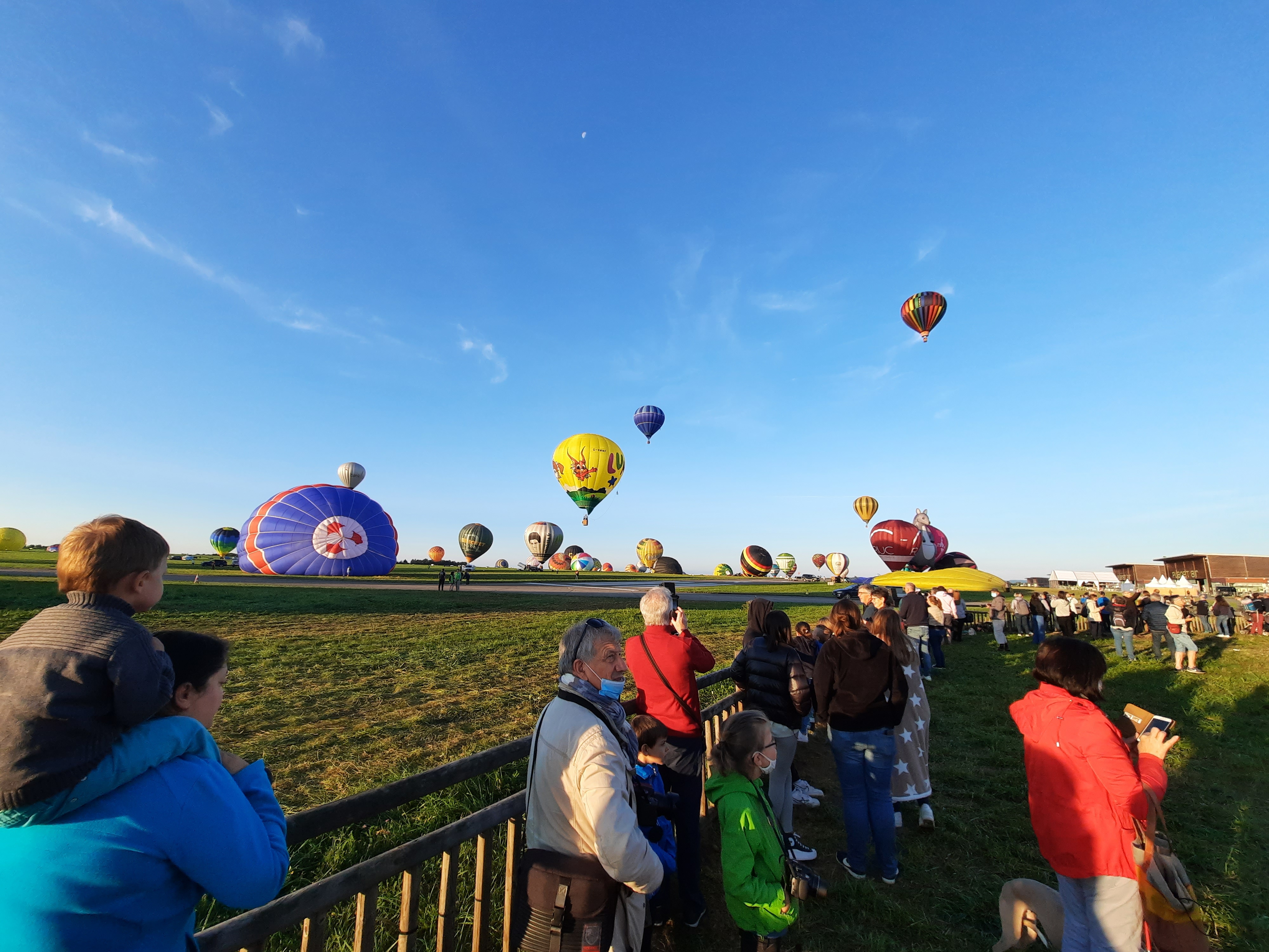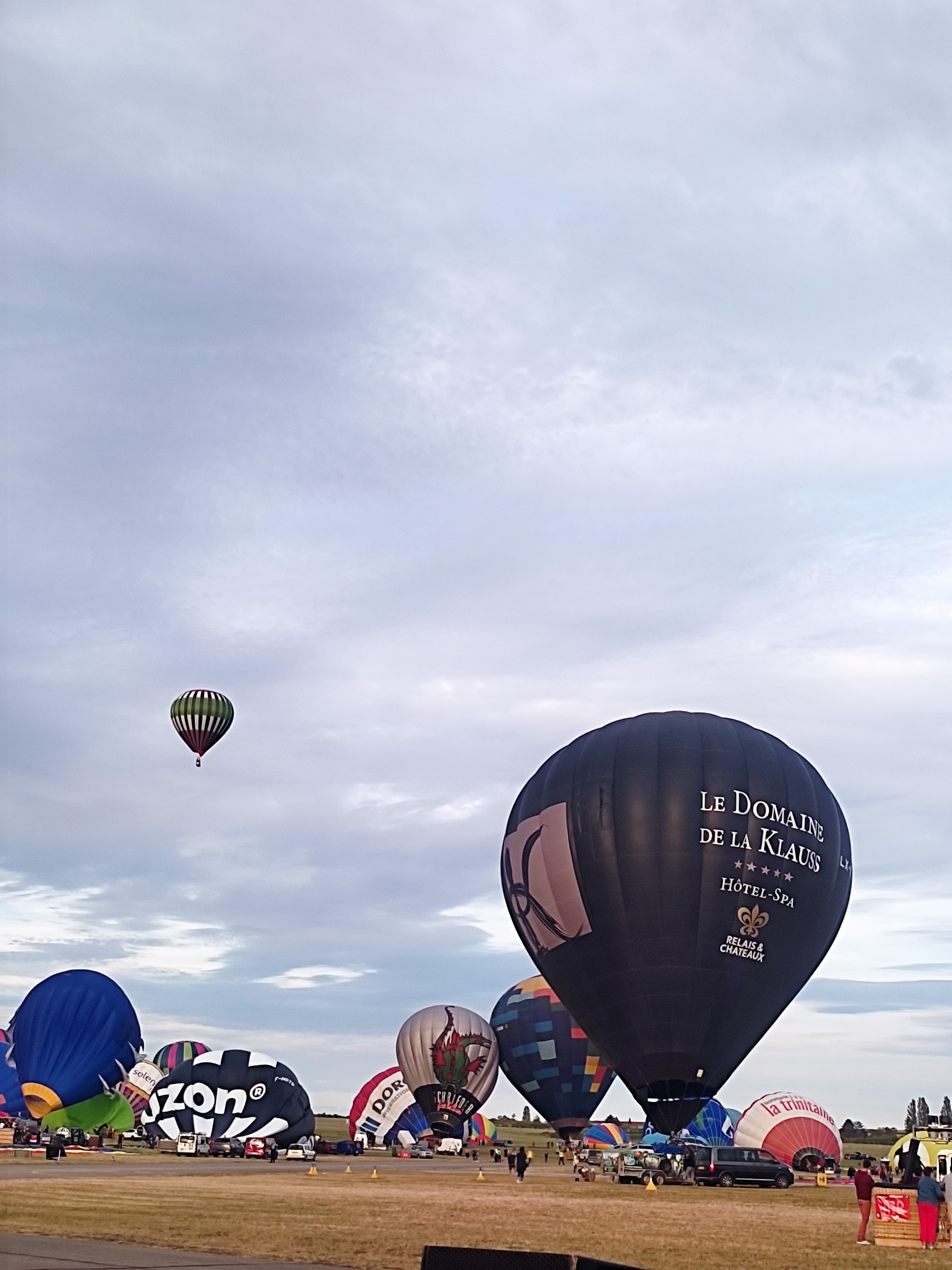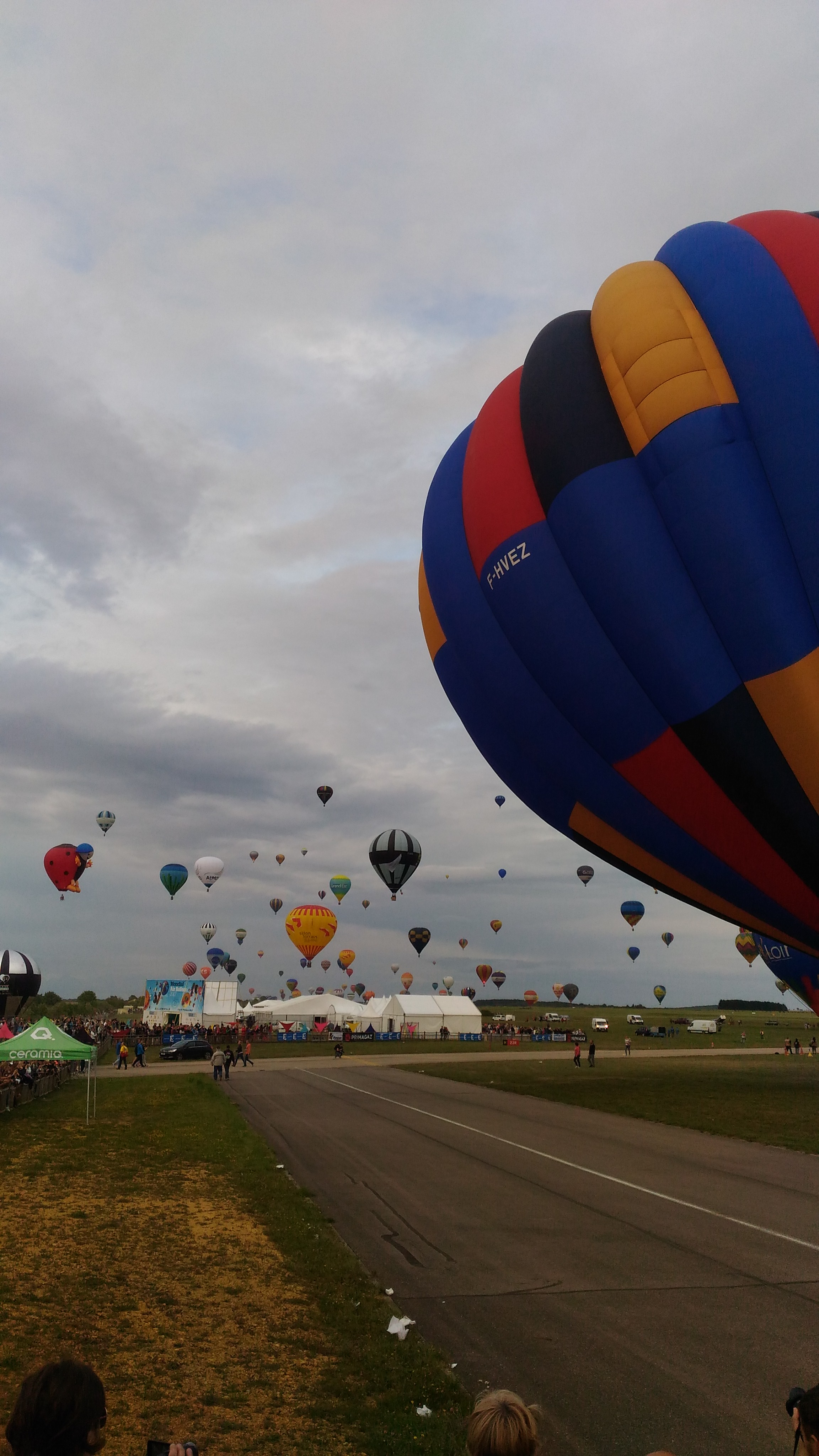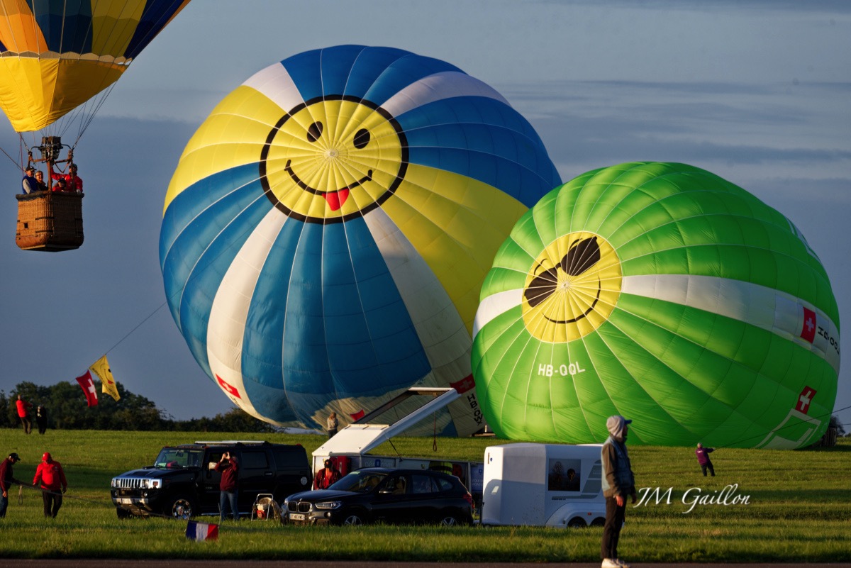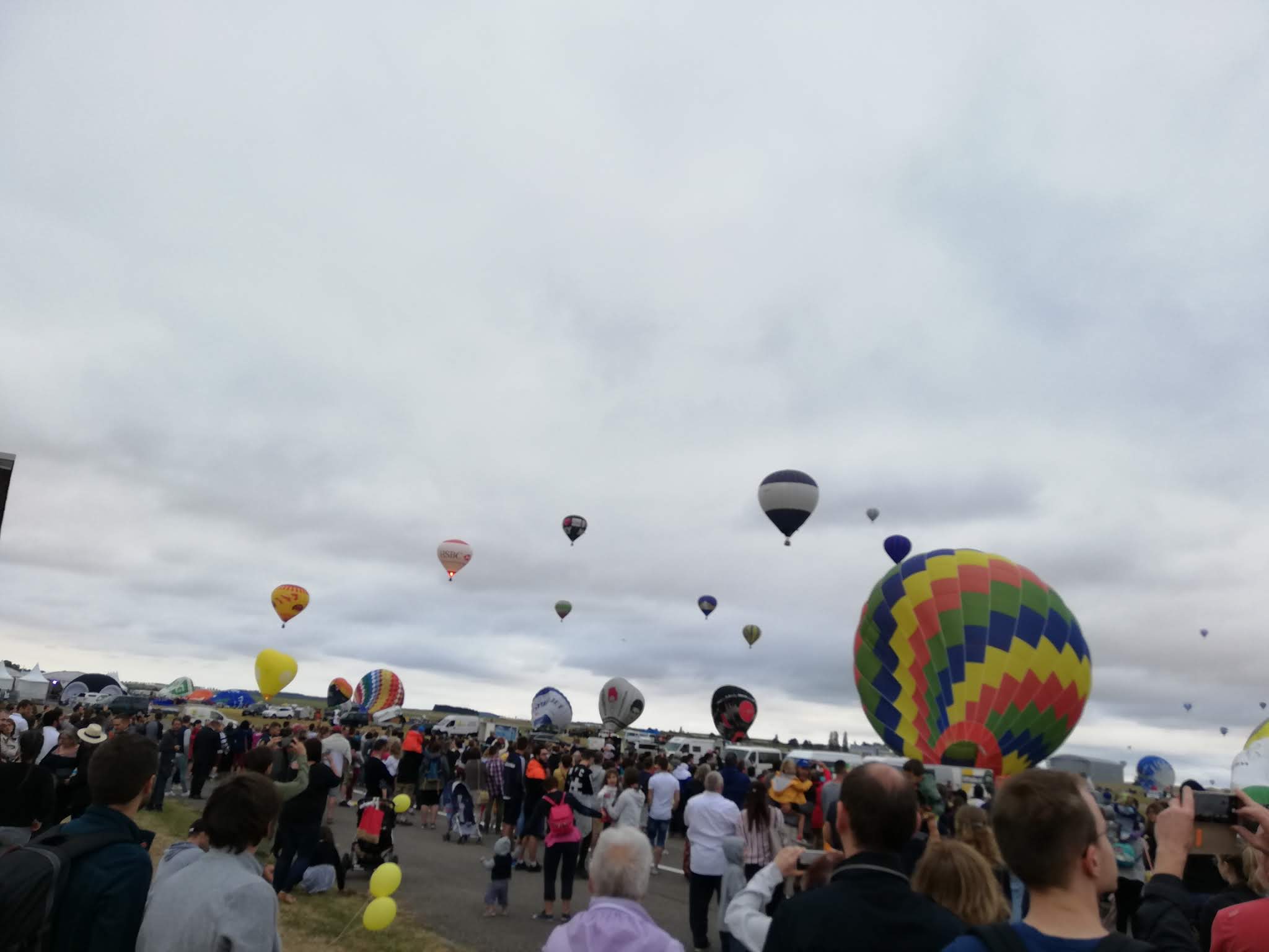 Beaucoup, beaucoup, beaucoup de monde pour aller voir un départ à 18h00. Environ 40 minutes de files de voitures pour voir l'entrée du site et se faire délester vers le parking sud par les gendarmes. Arrivé au parking sur des champs, 15 minutes de marche pour accéder à l'entrée qui lui est gratuit. Gratuit, mot qui temps à disparaître du vocabulaire Français. Le service d'ordre refuse les bouteilles de bières et autres bouteilles, mais ça passe quand même, car vérifier les sacs, les poussettes, les sacs à dos, les glacières. Pas chose facile. Reste à se placer sur les espaces encore libre devant la piste d'envol. Pas de chance, pas de départ faute à trop de vent, la foule se précipite pour sortir rapidement. Pas de chance, encore 1h00 pour sortir du parking principal. Le notre, personne, et les gendarmes sécurisés les sorties, bien. Restauration possible, wc public en nombres dispo, expo, mongolfière à doudou pour les enfants, bref, de quoi vous distraire. Merci aux organisateurs pour ce fabuleux évènement qui se tient tous les 2 ans. C'est un sacré boulot de tout prévoir, sauf la météo, là on subit.