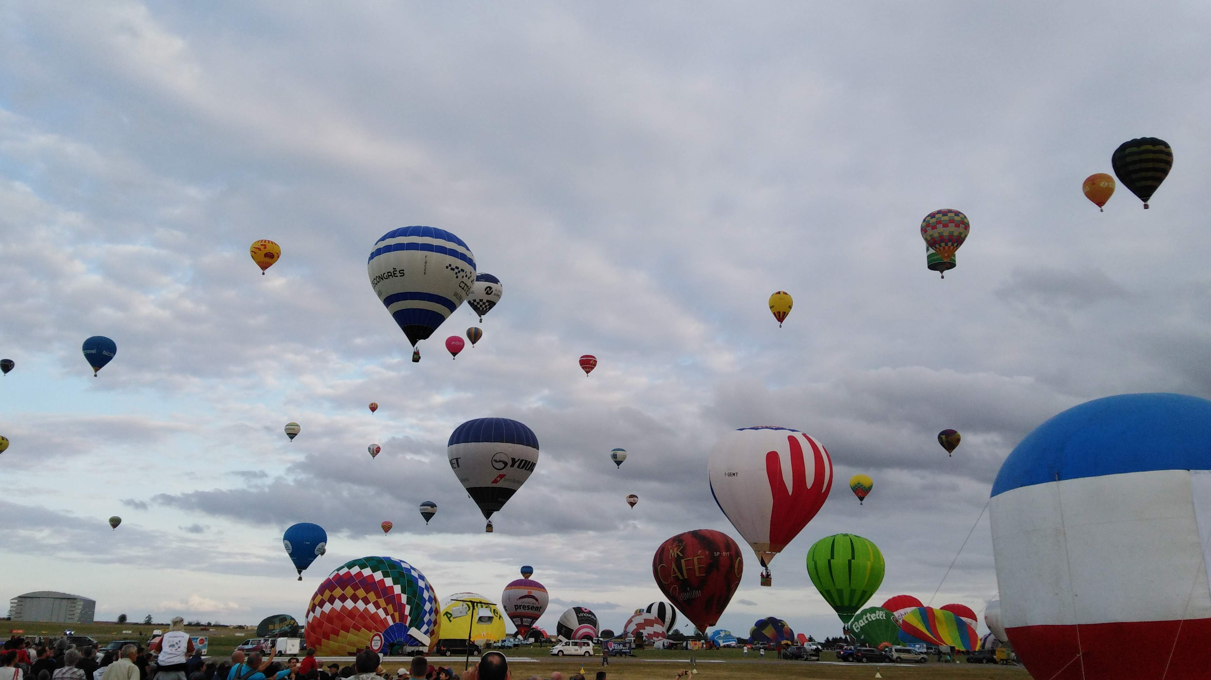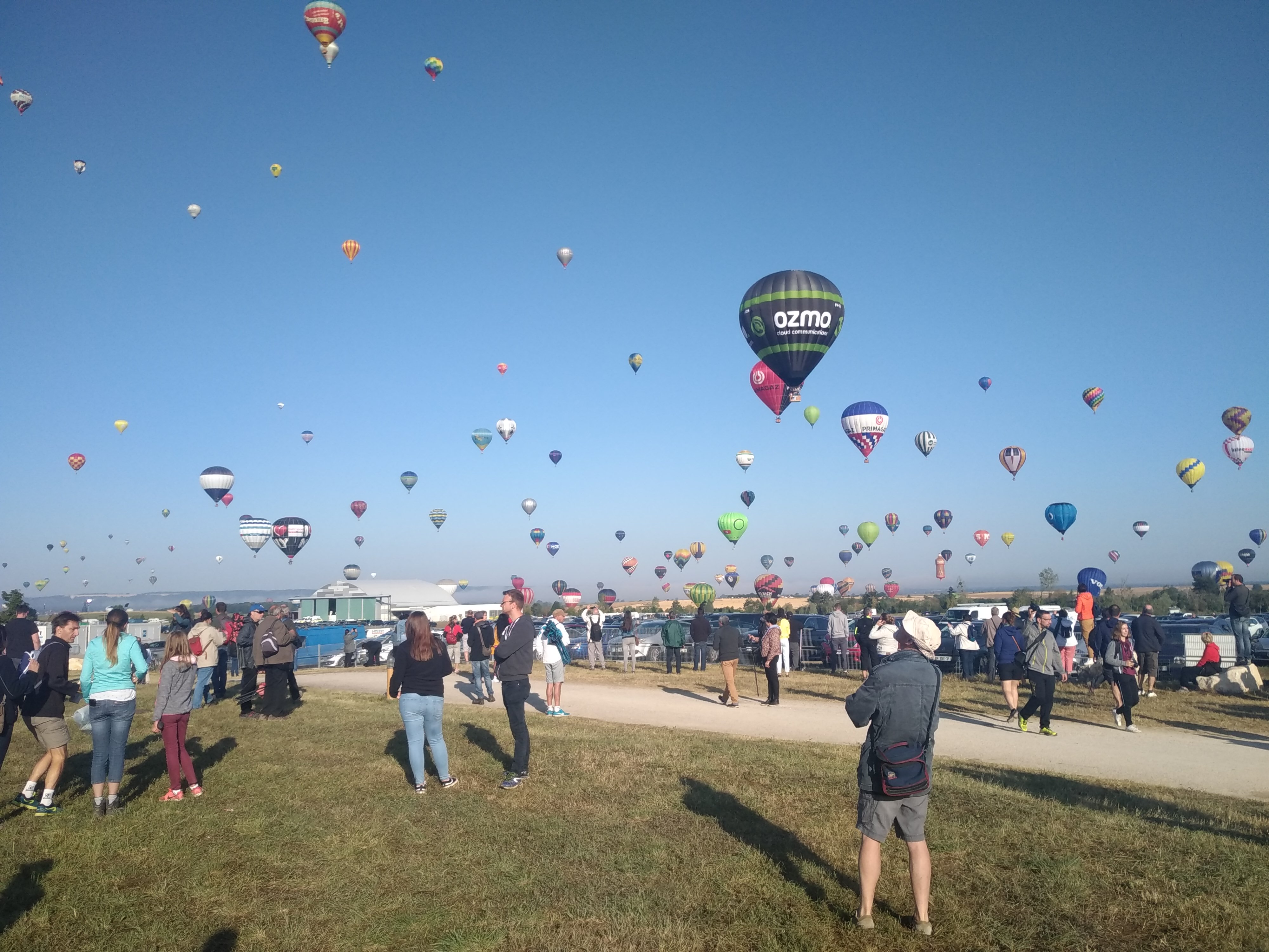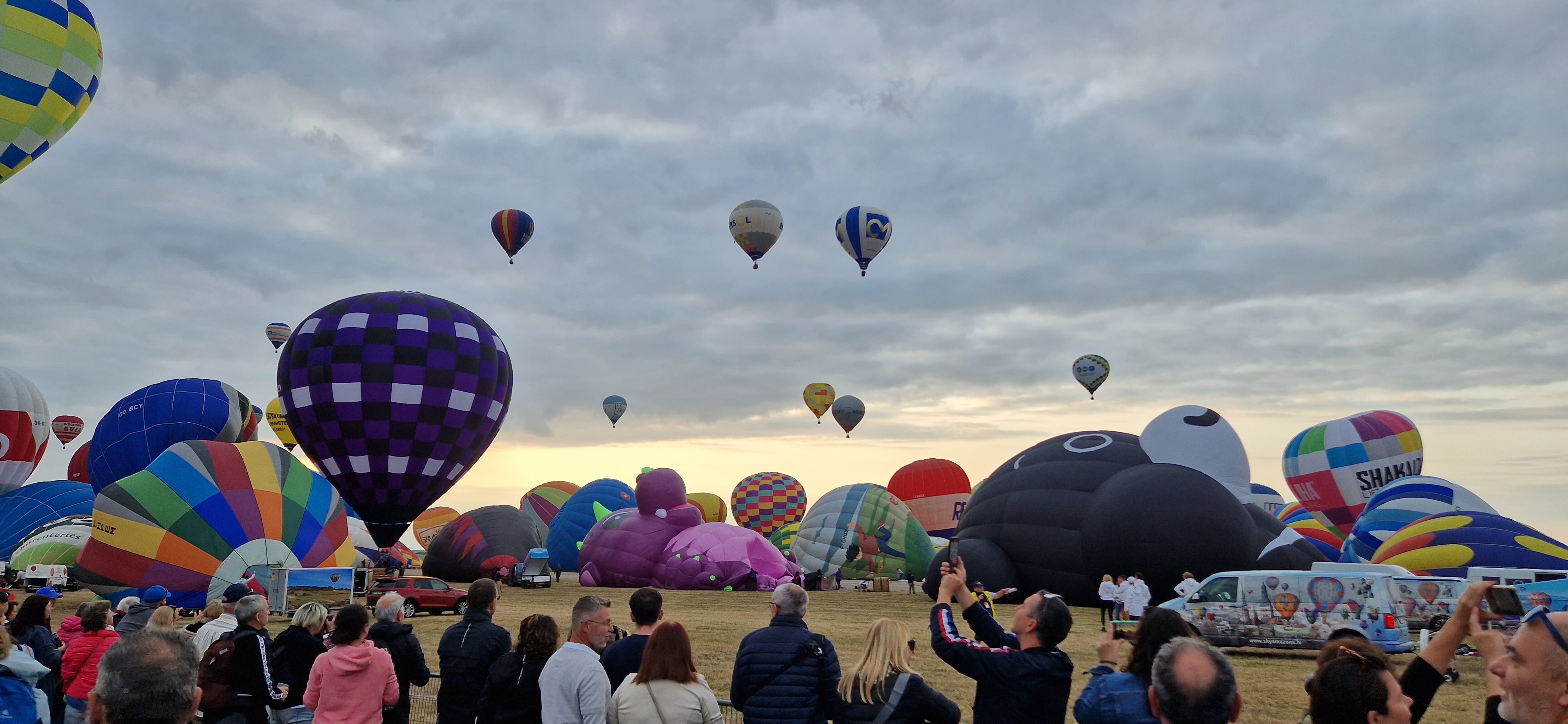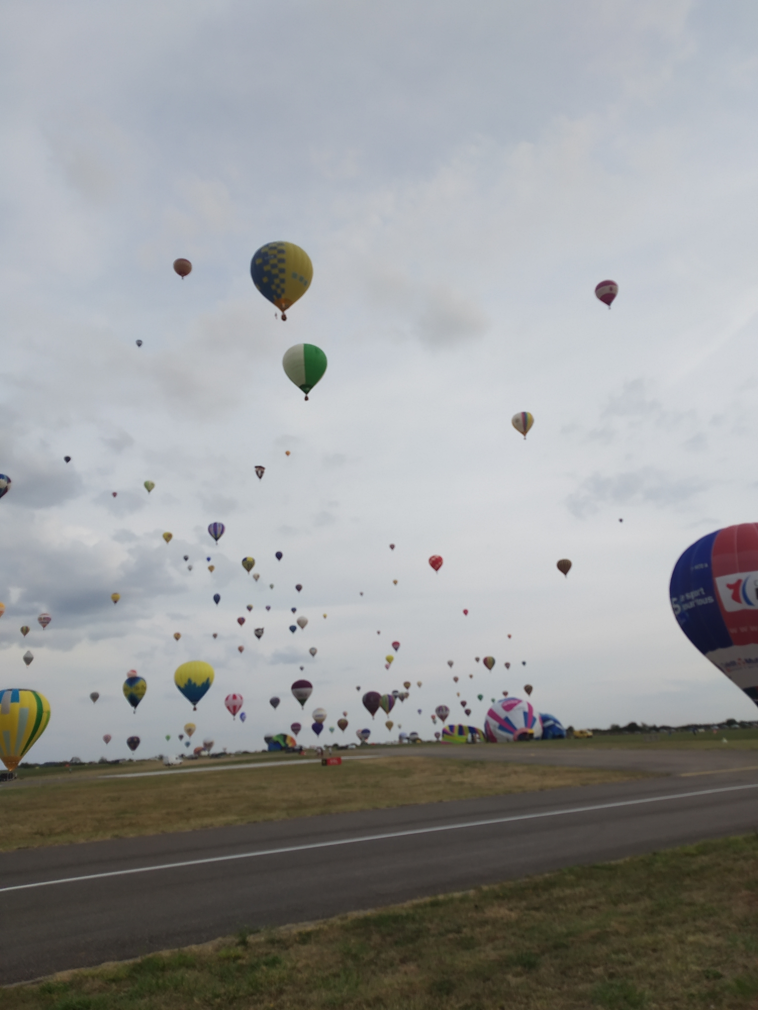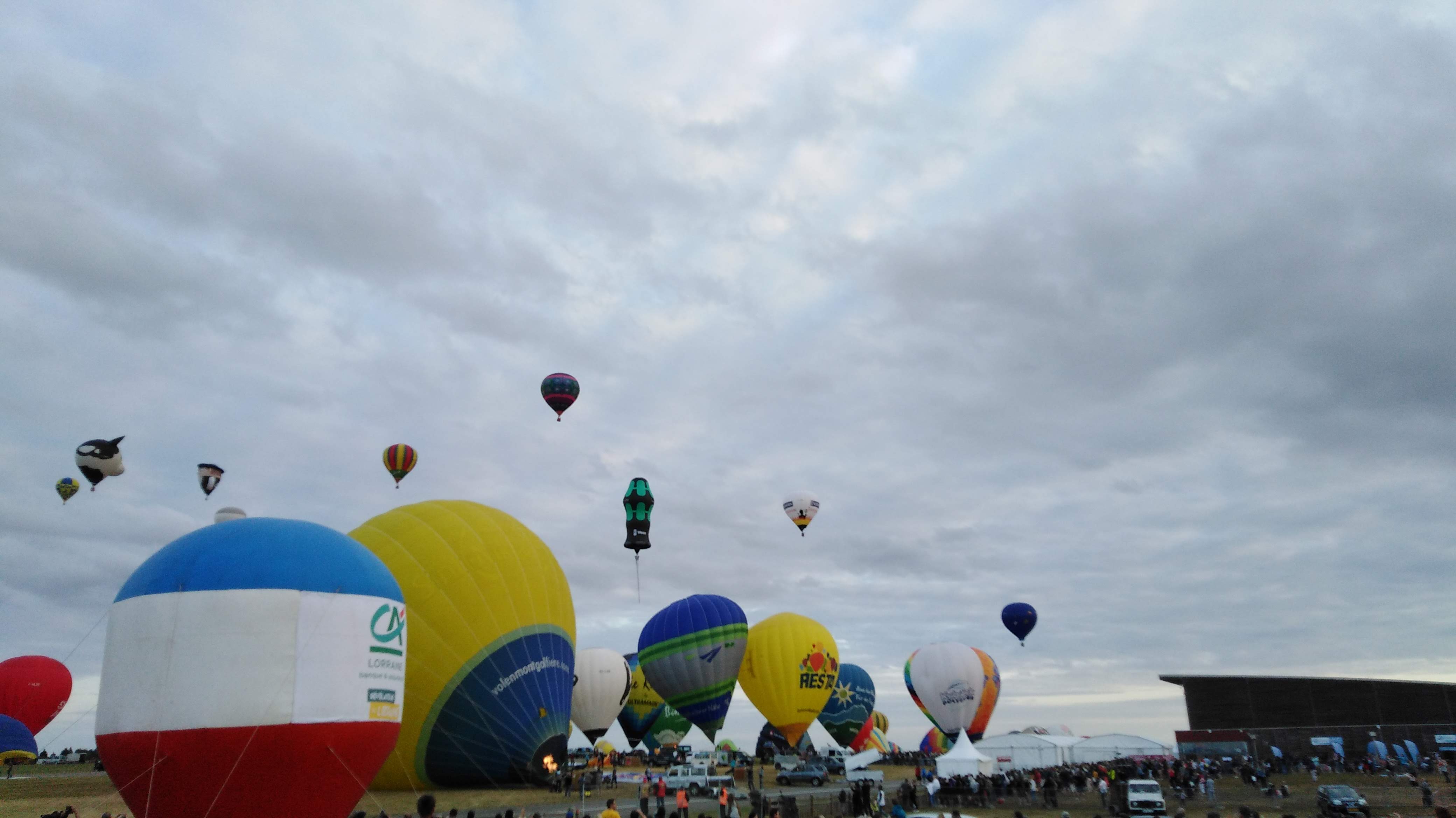 Beaucoup, beaucoup, beaucoup de monde pour aller voir un départ à 18h00. Environ 40 minutes de files de voitures pour voir l'entrée du site et se faire délester vers le parking sud par les gendarmes. Arrivé au parking sur des champs, 15 minutes de marche pour accéder à l'entrée qui lui est gratuit. Gratuit, mot qui temps à disparaître du vocabulaire Français. Le service d'ordre refuse les bouteilles de bières et autres bouteilles, mais ça passe quand même, car vérifier les sacs, les poussettes, les sacs à dos, les glacières. Pas chose facile. Reste à se placer sur les espaces encore libre devant la piste d'envol. Pas de chance, pas de départ faute à trop de vent, la foule se précipite pour sortir rapidement. Pas de chance, encore 1h00 pour sortir du parking principal. Le notre, personne, et les gendarmes sécurisés les sorties, bien. Restauration possible, wc public en nombres dispo, expo, mongolfière à doudou pour les enfants, bref, de quoi vous distraire. Merci aux organisateurs pour ce fabuleux évènement qui se tient tous les 2 ans. C'est un sacré boulot de tout prévoir, sauf la météo, là on subit.