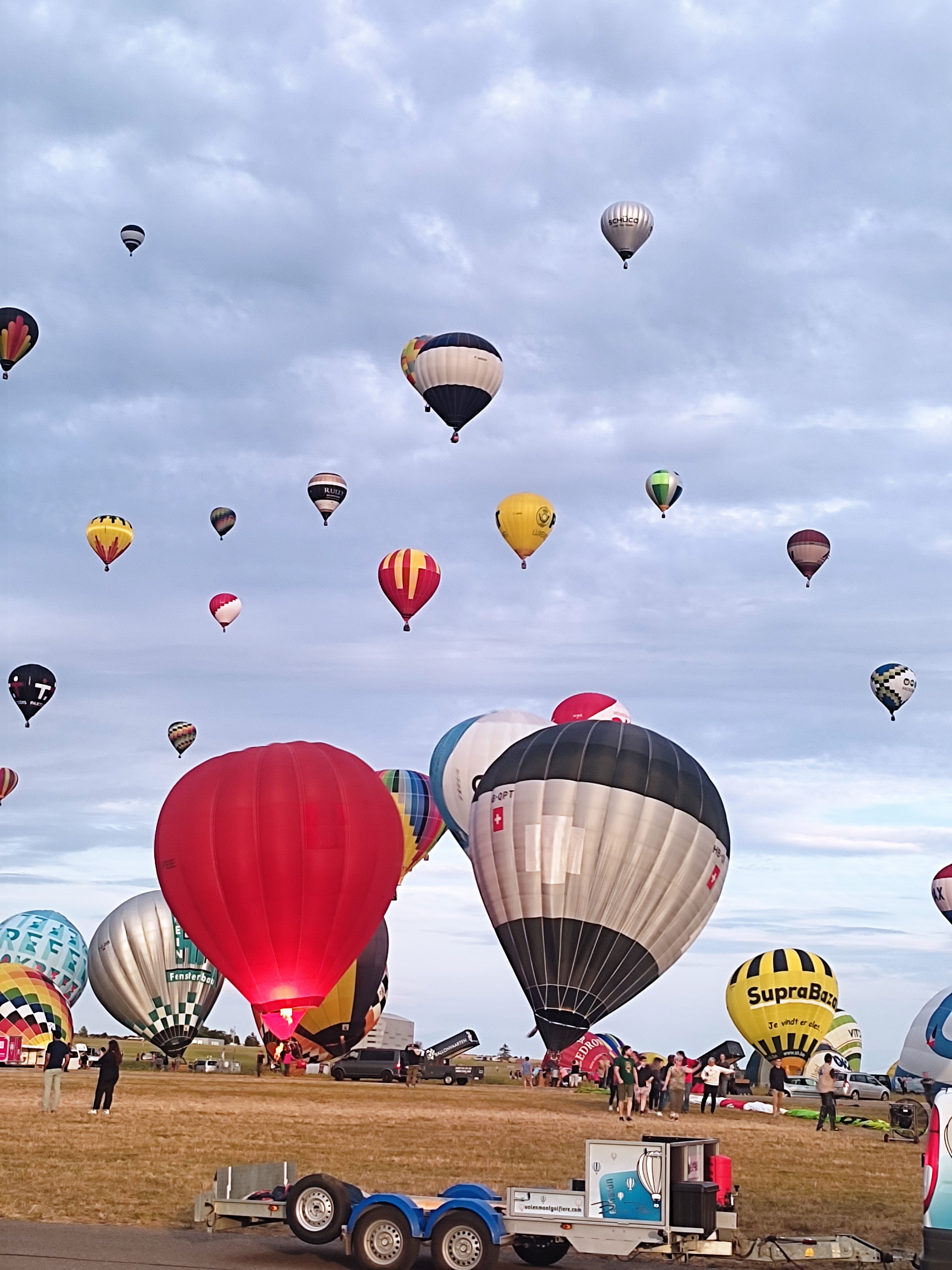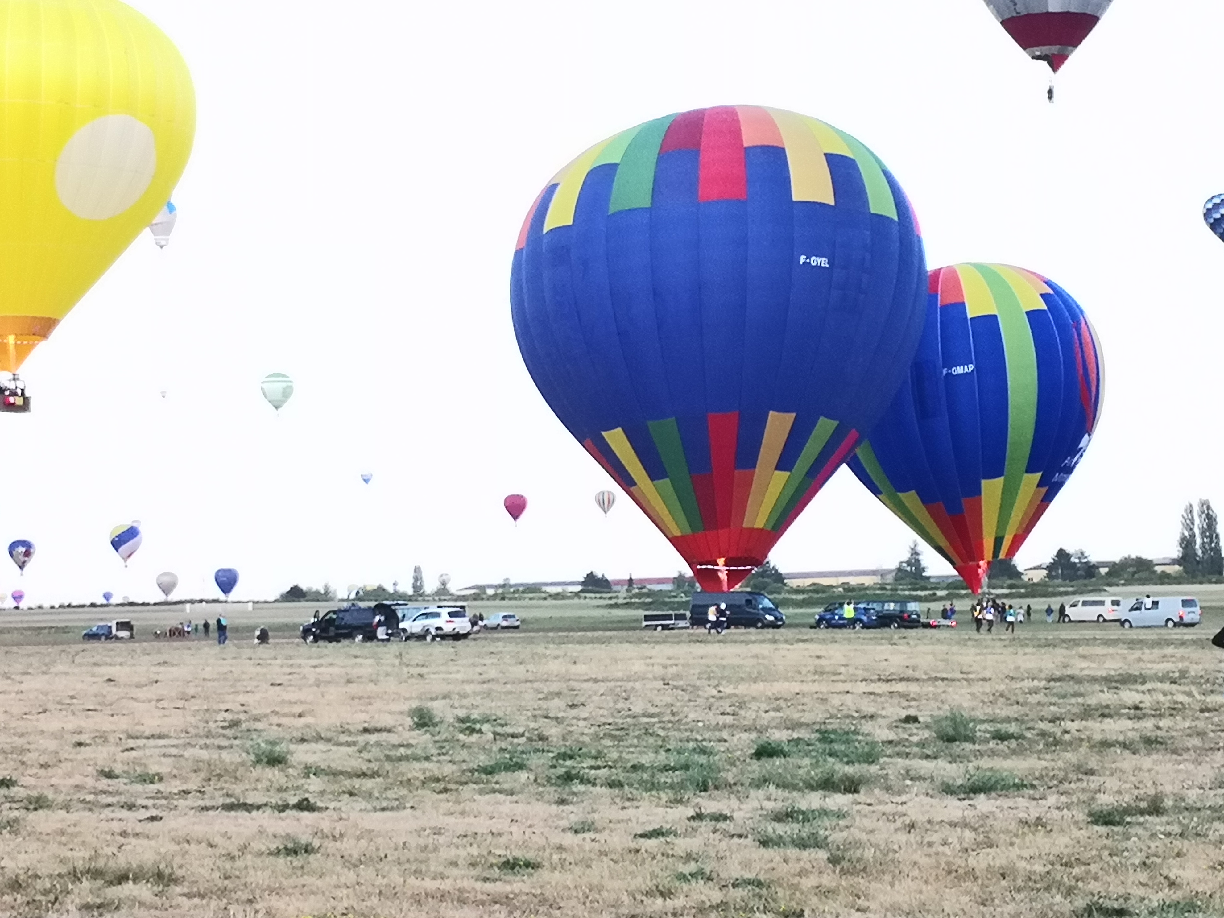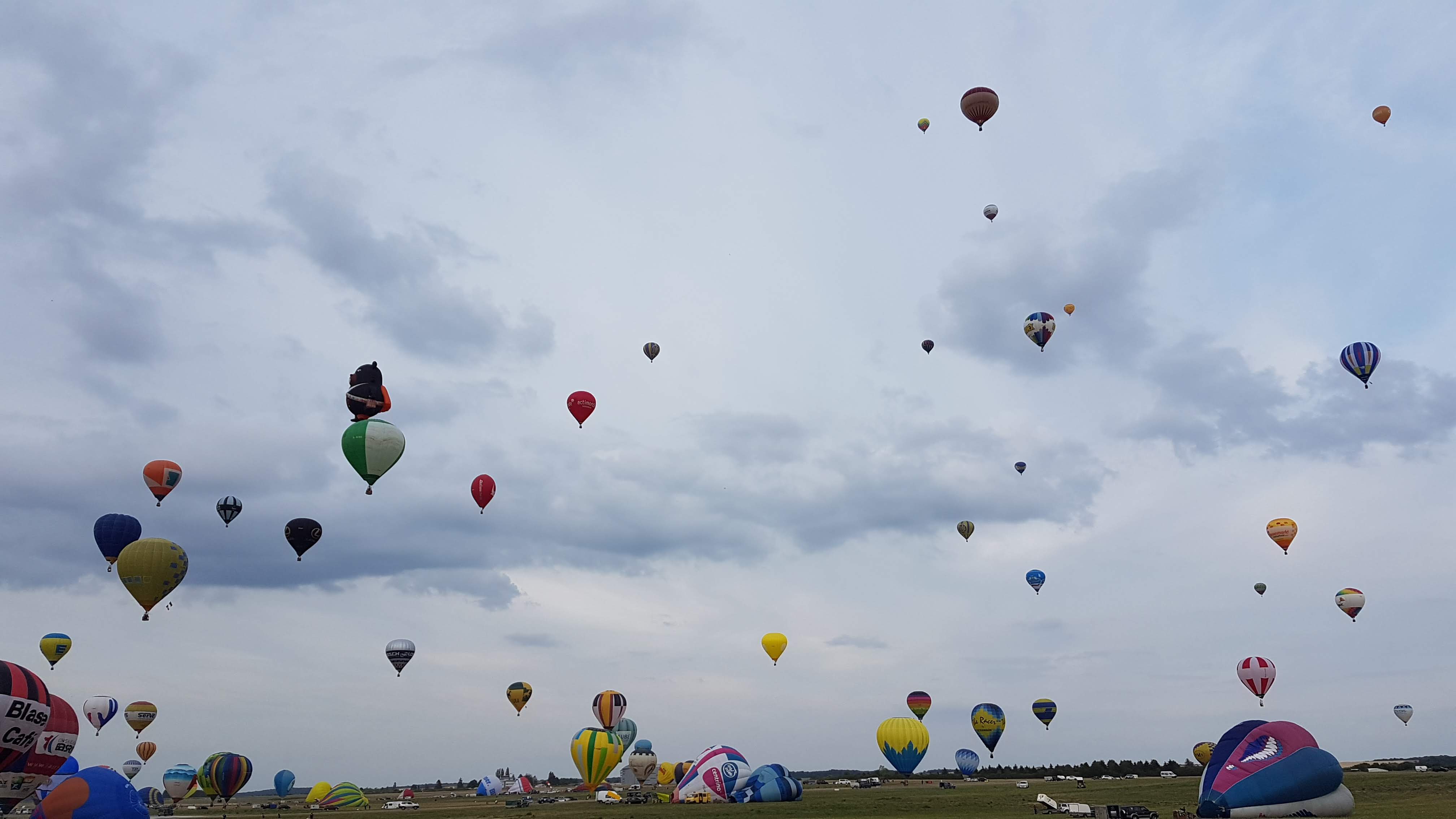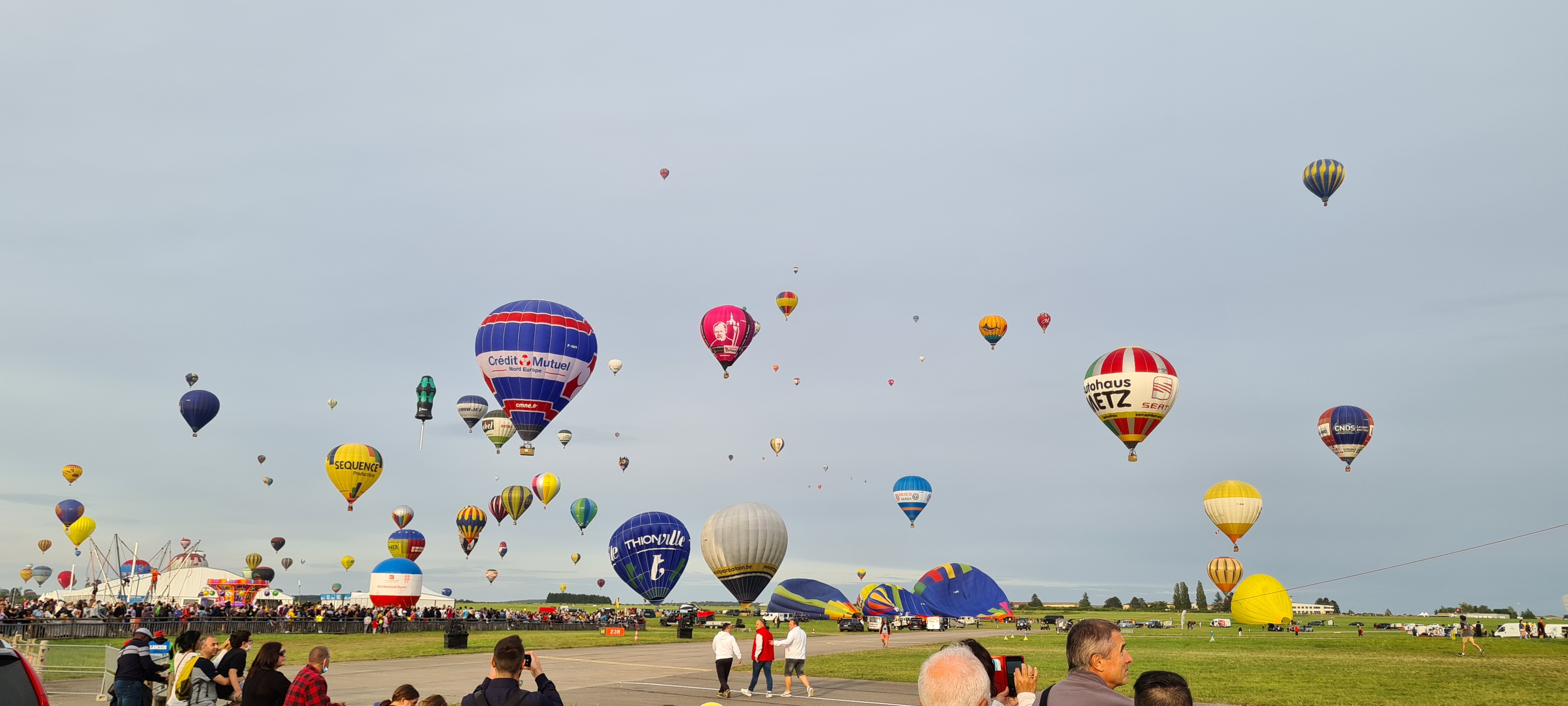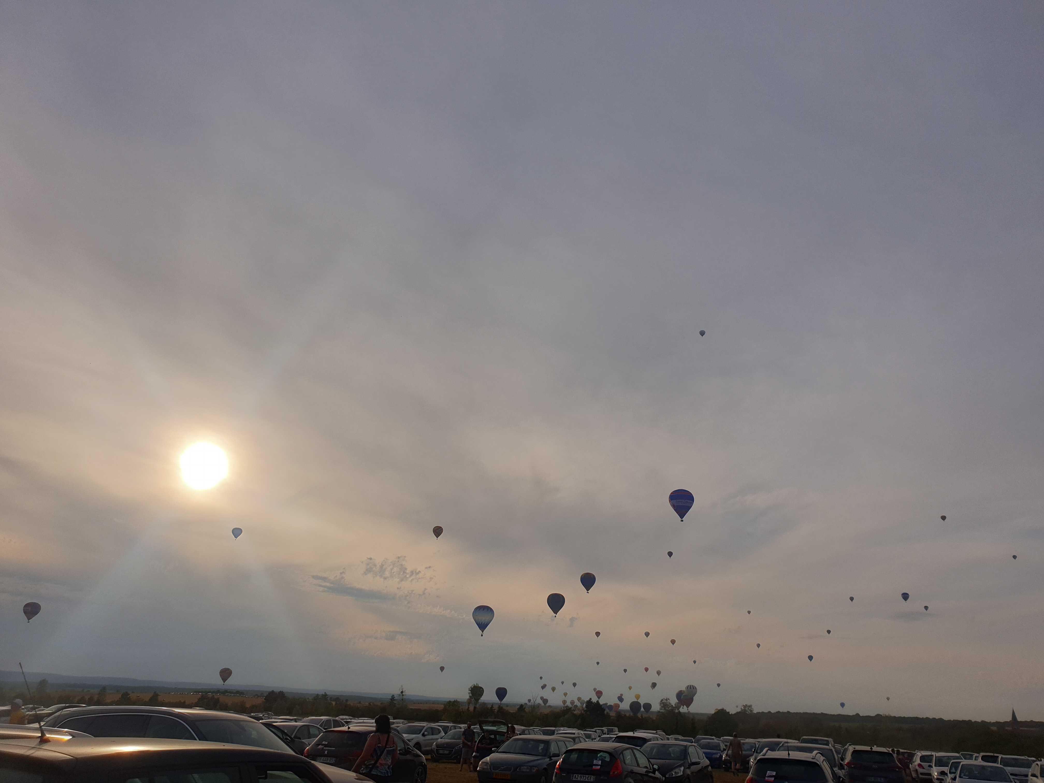 Beaucoup, beaucoup, beaucoup de monde pour aller voir un départ à 18h00. Environ 40 minutes de files de voitures pour voir l'entrée du site et se faire délester vers le parking sud par les gendarmes. Arrivé au parking sur des champs, 15 minutes de marche pour accéder à l'entrée qui lui est gratuit. Gratuit, mot qui temps à disparaître du vocabulaire Français. Le service d'ordre refuse les bouteilles de bières et autres bouteilles, mais ça passe quand même, car vérifier les sacs, les poussettes, les sacs à dos, les glacières. Pas chose facile. Reste à se placer sur les espaces encore libre devant la piste d'envol. Pas de chance, pas de départ faute à trop de vent, la foule se précipite pour sortir rapidement. Pas de chance, encore 1h00 pour sortir du parking principal. Le notre, personne, et les gendarmes sécurisés les sorties, bien. Restauration possible, wc public en nombres dispo, expo, mongolfière à doudou pour les enfants, bref, de quoi vous distraire. Merci aux organisateurs pour ce fabuleux évènement qui se tient tous les 2 ans. C'est un sacré boulot de tout prévoir, sauf la météo, là on subit.