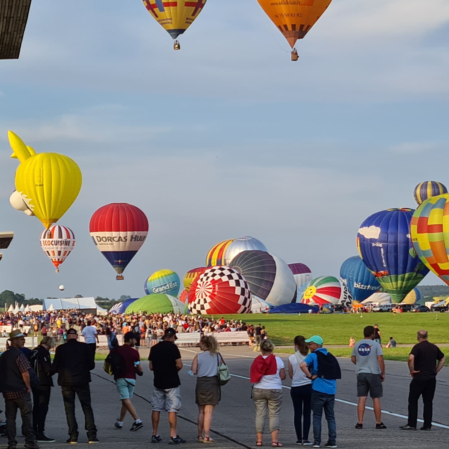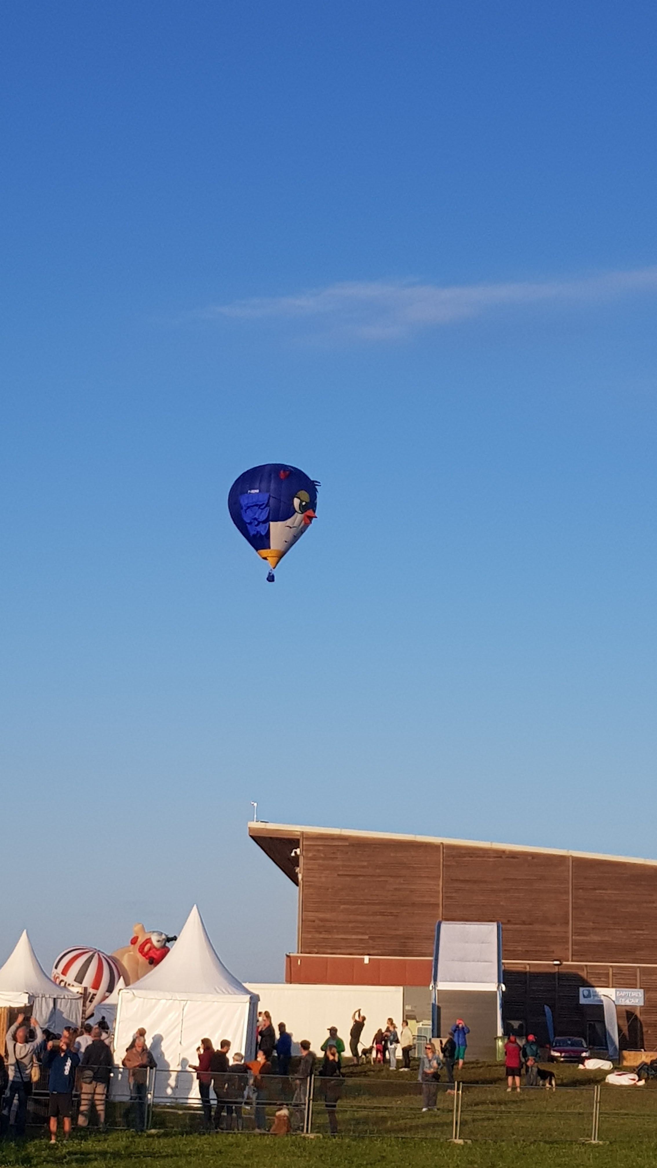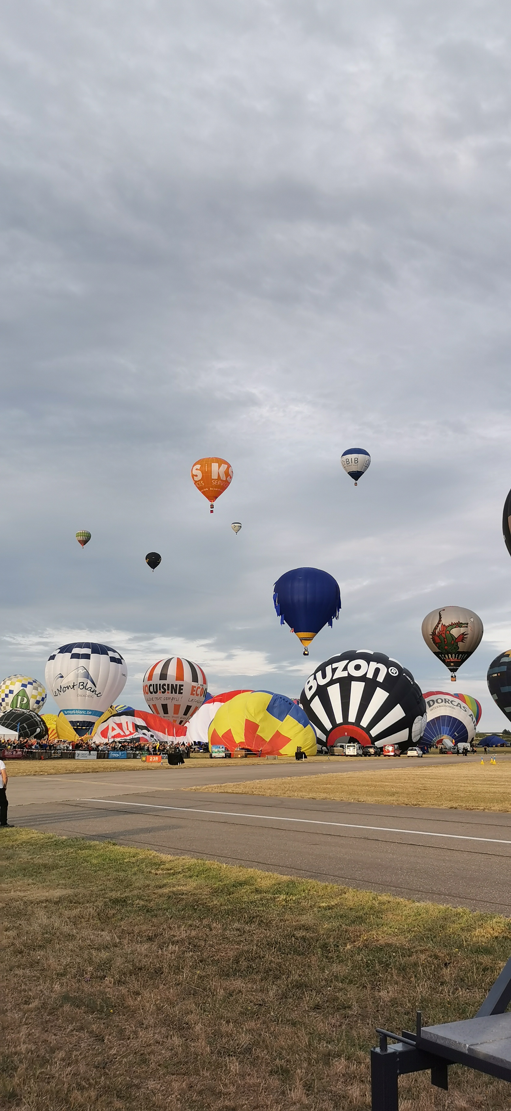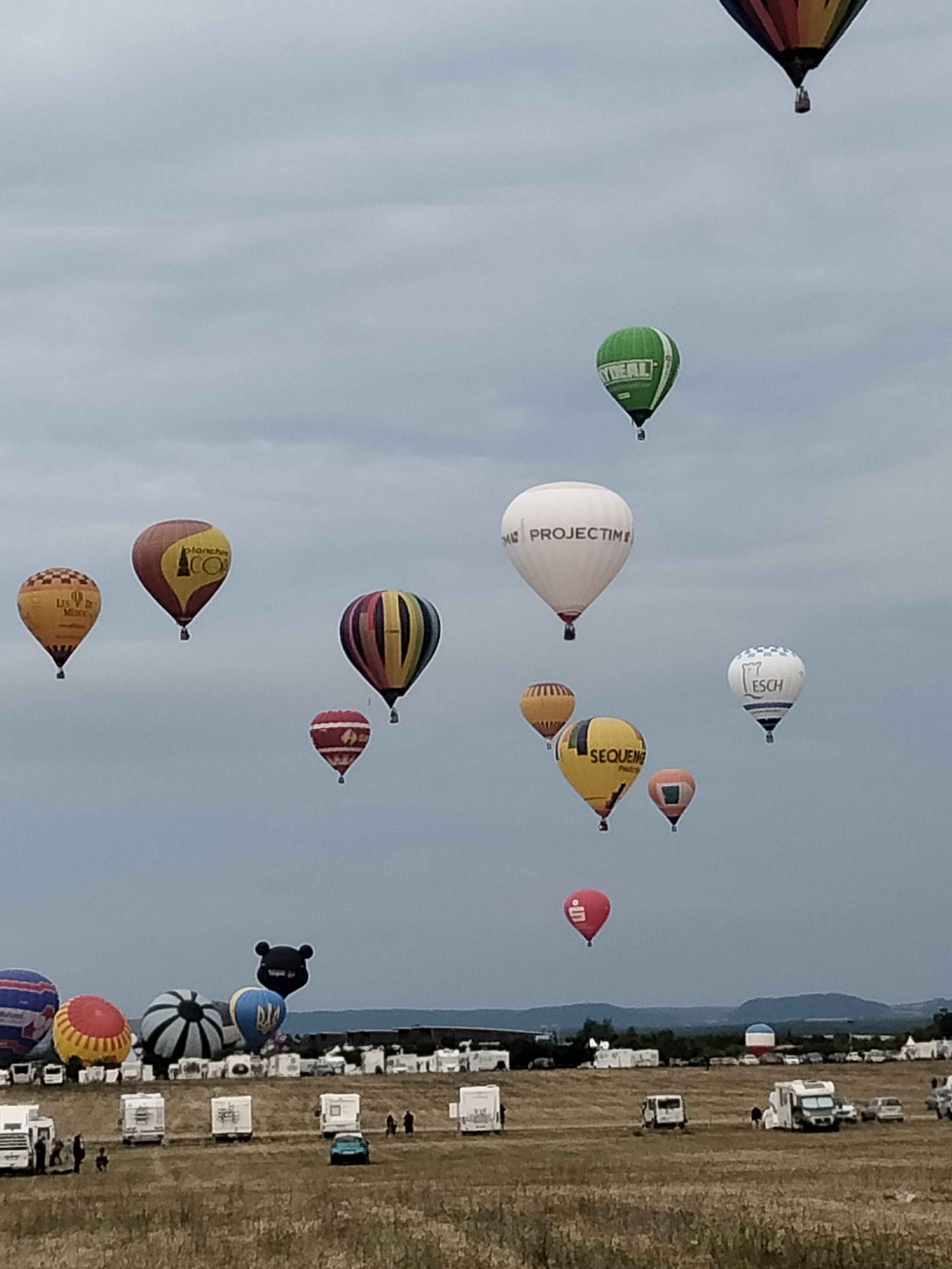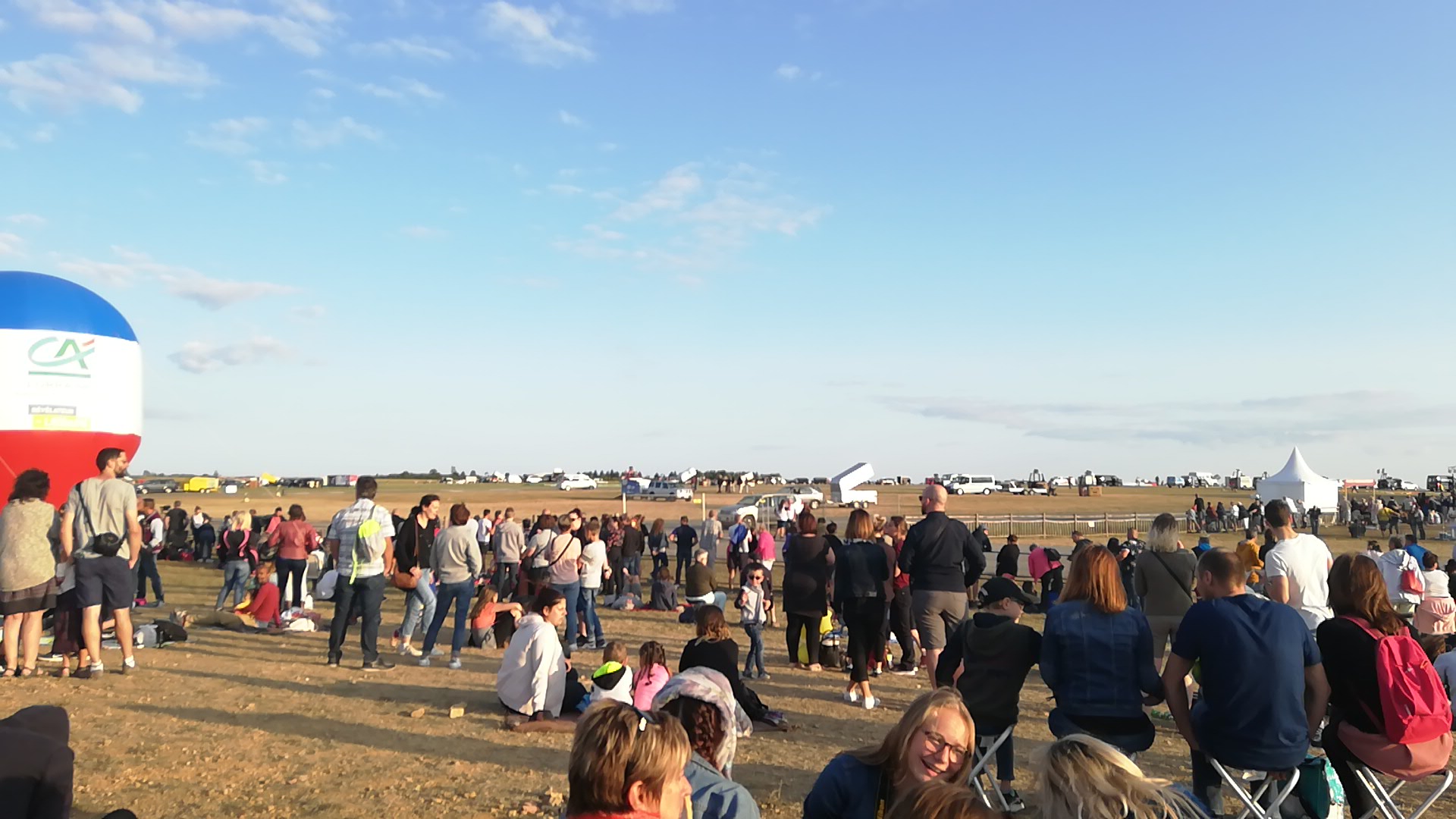 Beaucoup, beaucoup, beaucoup de monde pour aller voir un départ à 18h00. Environ 40 minutes de files de voitures pour voir l'entrée du site et se faire délester vers le parking sud par les gendarmes. Arrivé au parking sur des champs, 15 minutes de marche pour accéder à l'entrée qui lui est gratuit. Gratuit, mot qui temps à disparaître du vocabulaire Français. Le service d'ordre refuse les bouteilles de bières et autres bouteilles, mais ça passe quand même, car vérifier les sacs, les poussettes, les sacs à dos, les glacières. Pas chose facile. Reste à se placer sur les espaces encore libre devant la piste d'envol. Pas de chance, pas de départ faute à trop de vent, la foule se précipite pour sortir rapidement. Pas de chance, encore 1h00 pour sortir du parking principal. Le notre, personne, et les gendarmes sécurisés les sorties, bien. Restauration possible, wc public en nombres dispo, expo, mongolfière à doudou pour les enfants, bref, de quoi vous distraire. Merci aux organisateurs pour ce fabuleux évènement qui se tient tous les 2 ans. C'est un sacré boulot de tout prévoir, sauf la météo, là on subit.