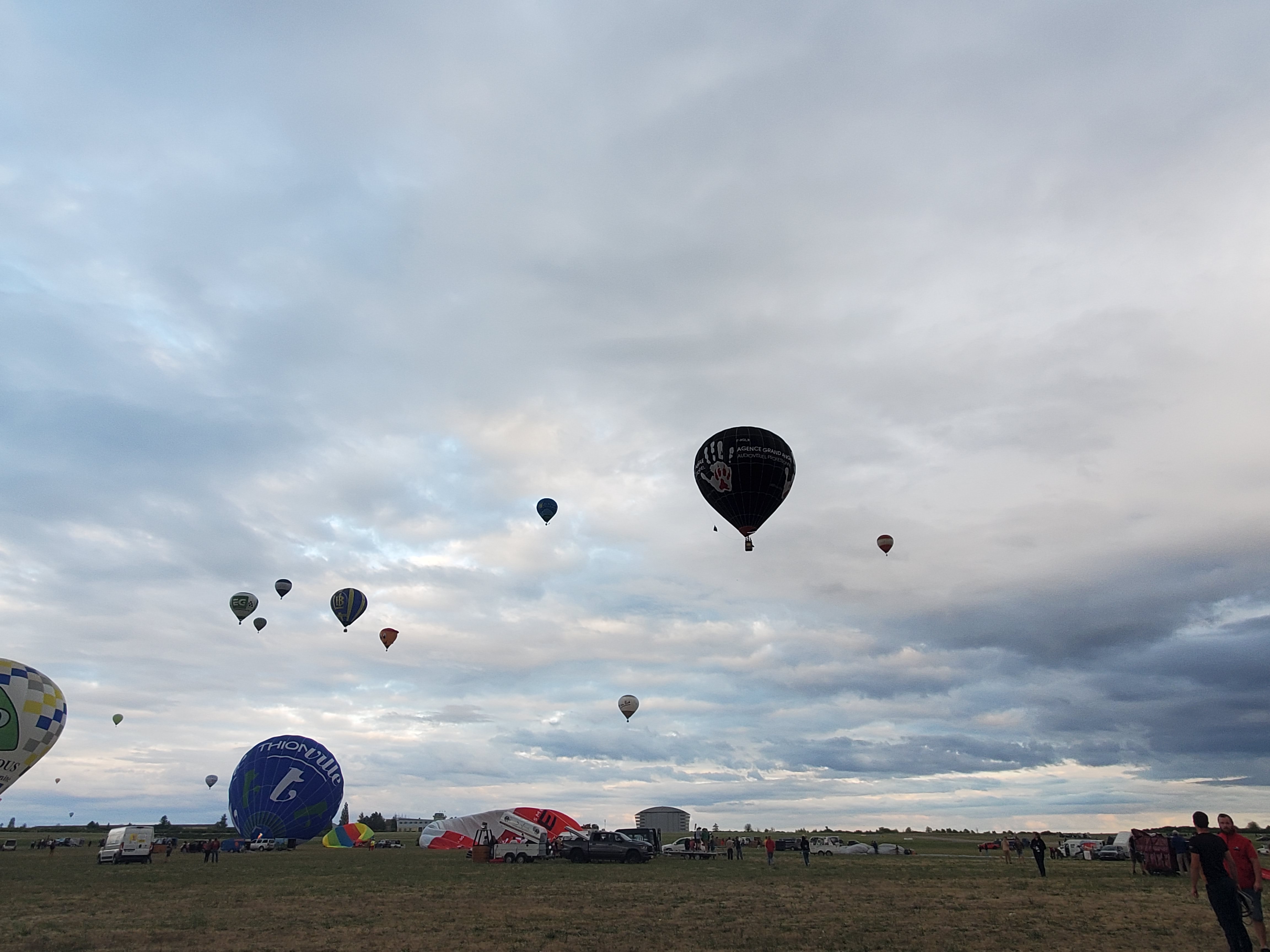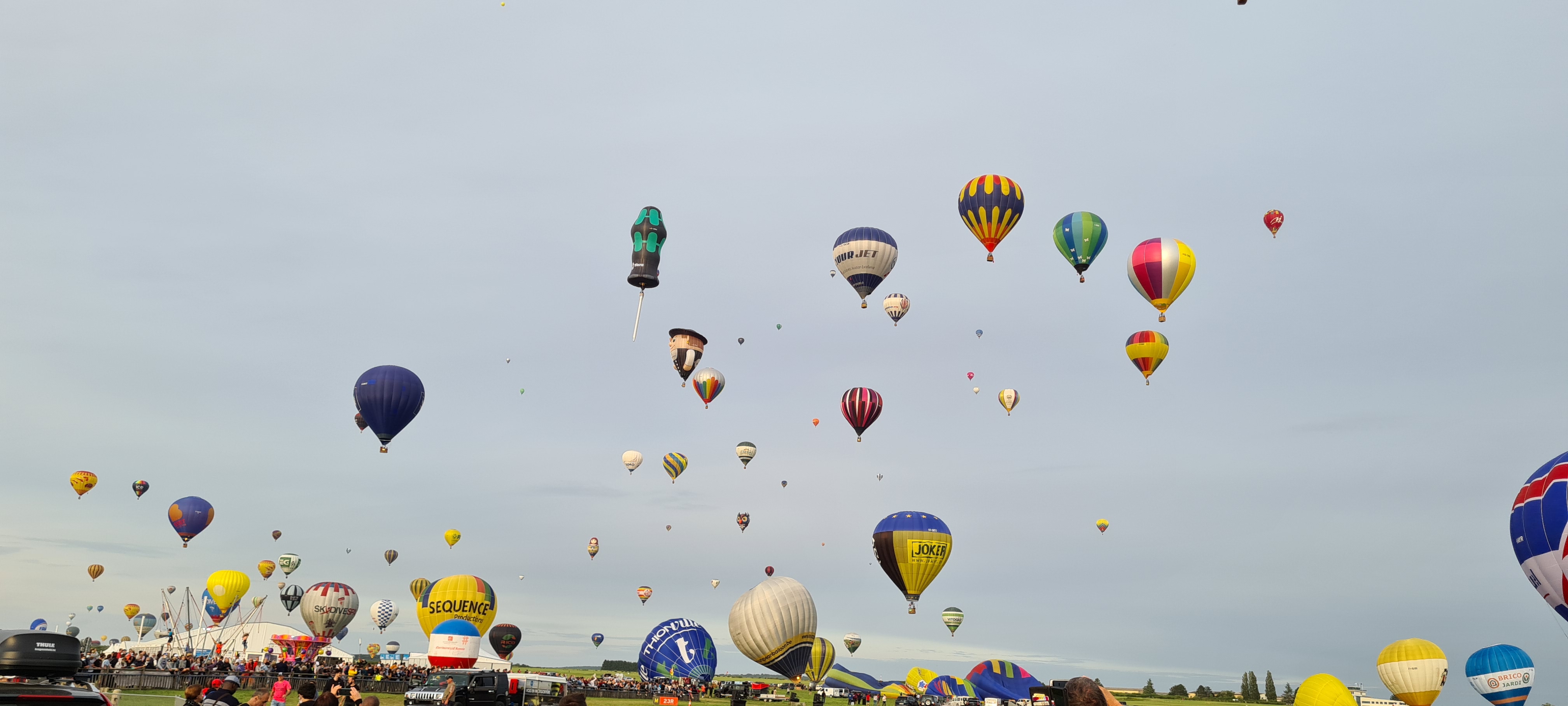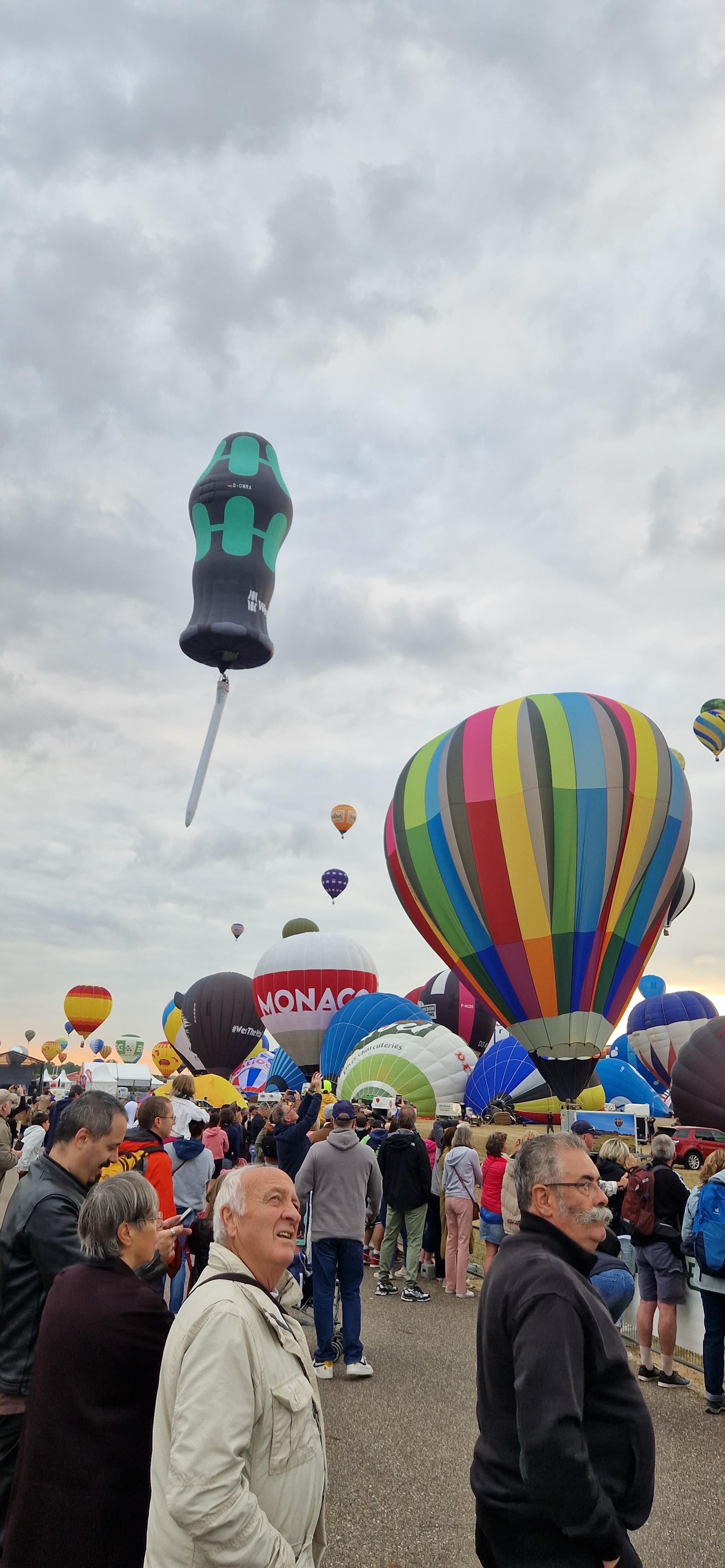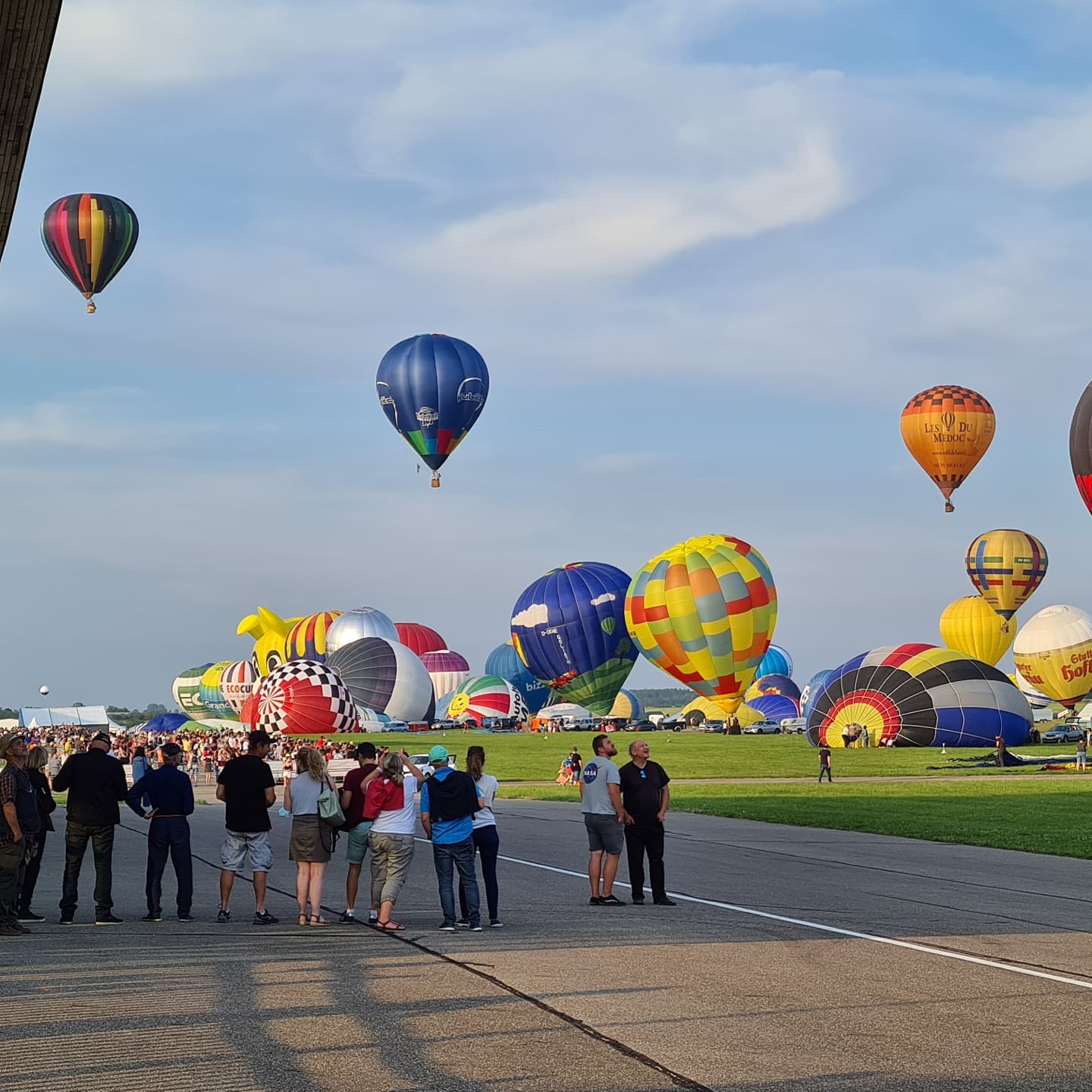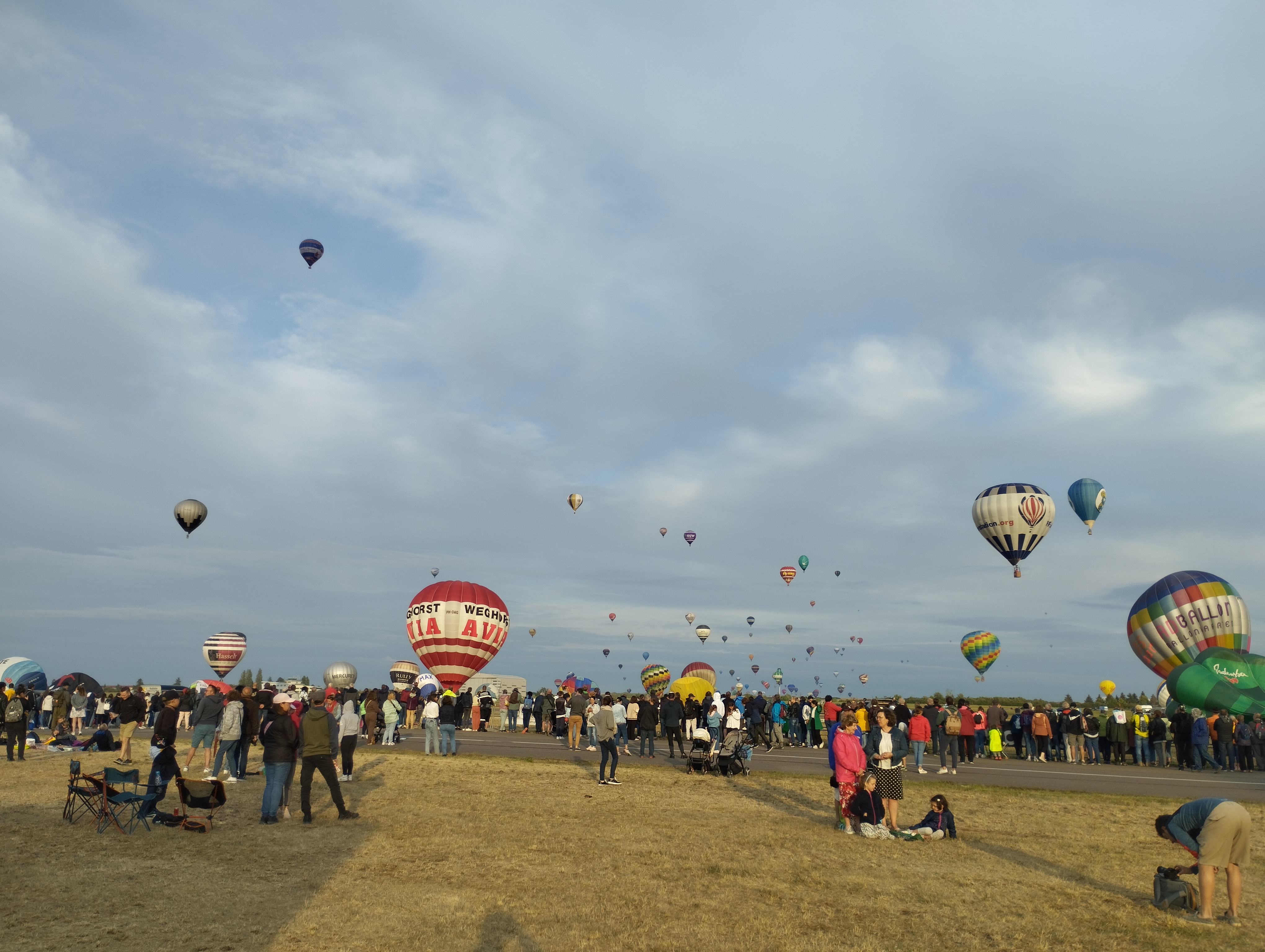 Beaucoup, beaucoup, beaucoup de monde pour aller voir un départ à 18h00. Environ 40 minutes de files de voitures pour voir l'entrée du site et se faire délester vers le parking sud par les gendarmes. Arrivé au parking sur des champs, 15 minutes de marche pour accéder à l'entrée qui lui est gratuit. Gratuit, mot qui temps à disparaître du vocabulaire Français. Le service d'ordre refuse les bouteilles de bières et autres bouteilles, mais ça passe quand même, car vérifier les sacs, les poussettes, les sacs à dos, les glacières. Pas chose facile. Reste à se placer sur les espaces encore libre devant la piste d'envol. Pas de chance, pas de départ faute à trop de vent, la foule se précipite pour sortir rapidement. Pas de chance, encore 1h00 pour sortir du parking principal. Le notre, personne, et les gendarmes sécurisés les sorties, bien. Restauration possible, wc public en nombres dispo, expo, mongolfière à doudou pour les enfants, bref, de quoi vous distraire. Merci aux organisateurs pour ce fabuleux évènement qui se tient tous les 2 ans. C'est un sacré boulot de tout prévoir, sauf la météo, là on subit.