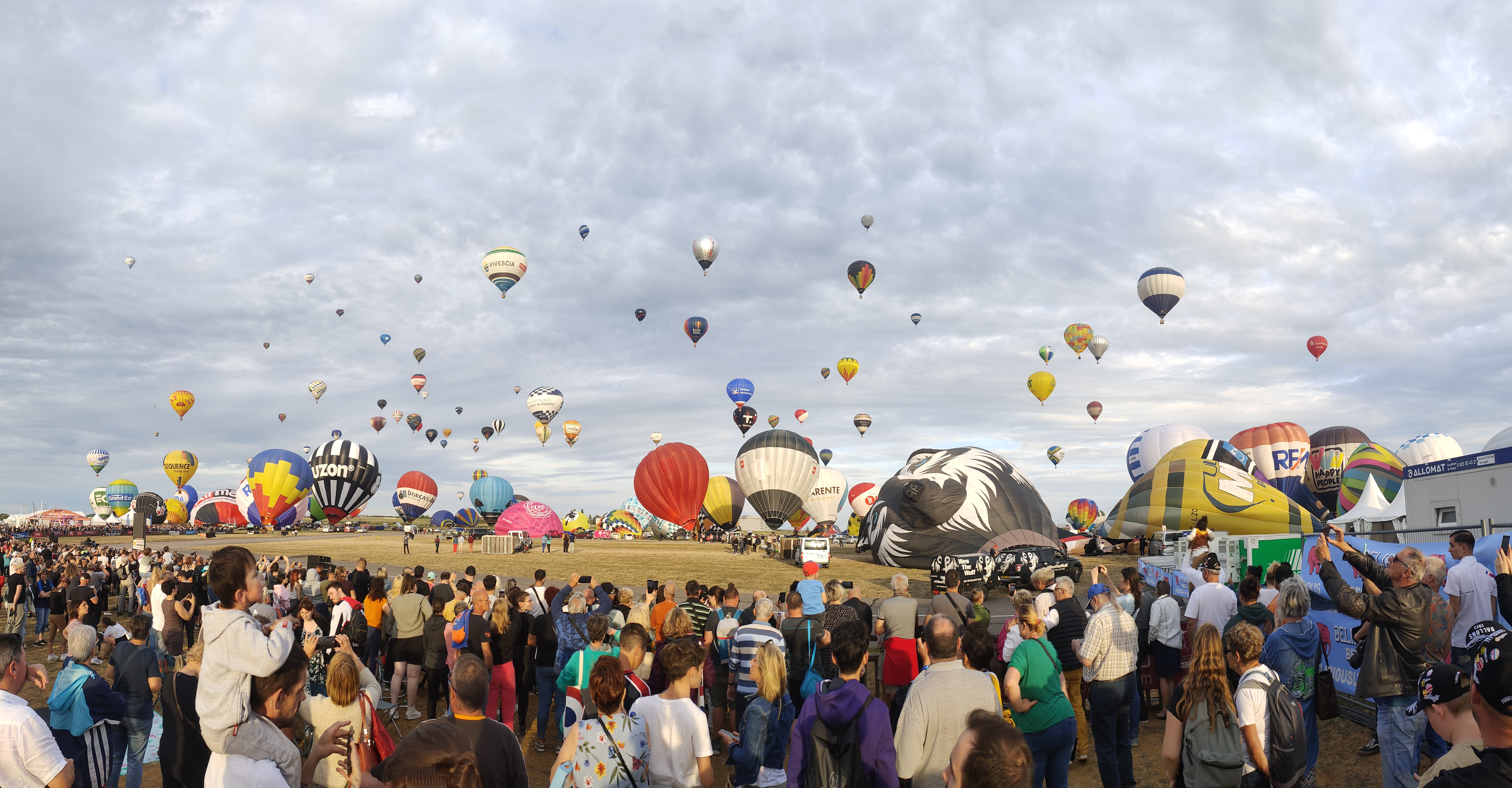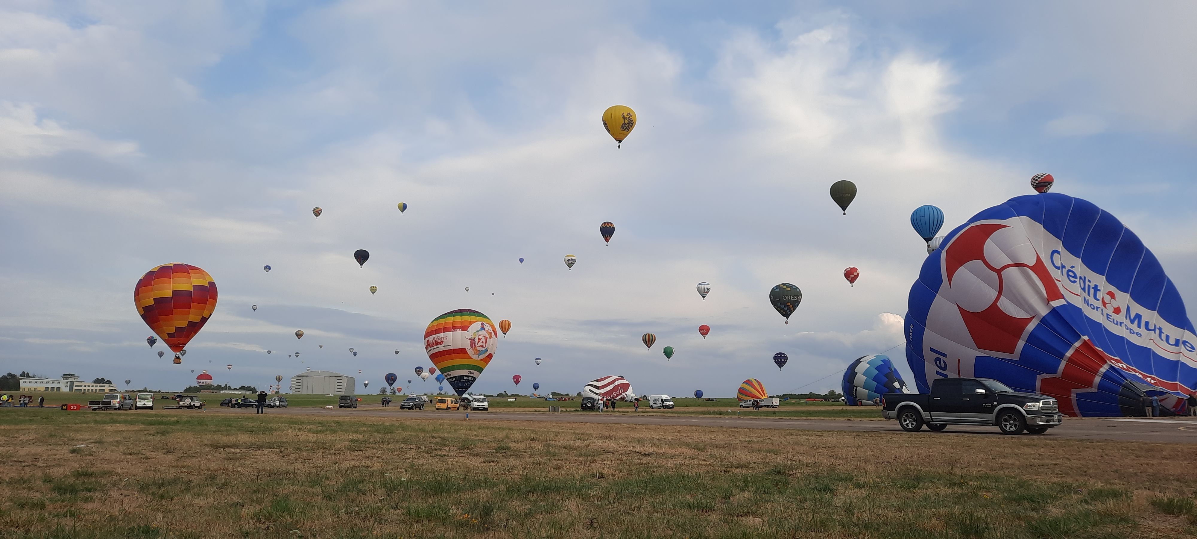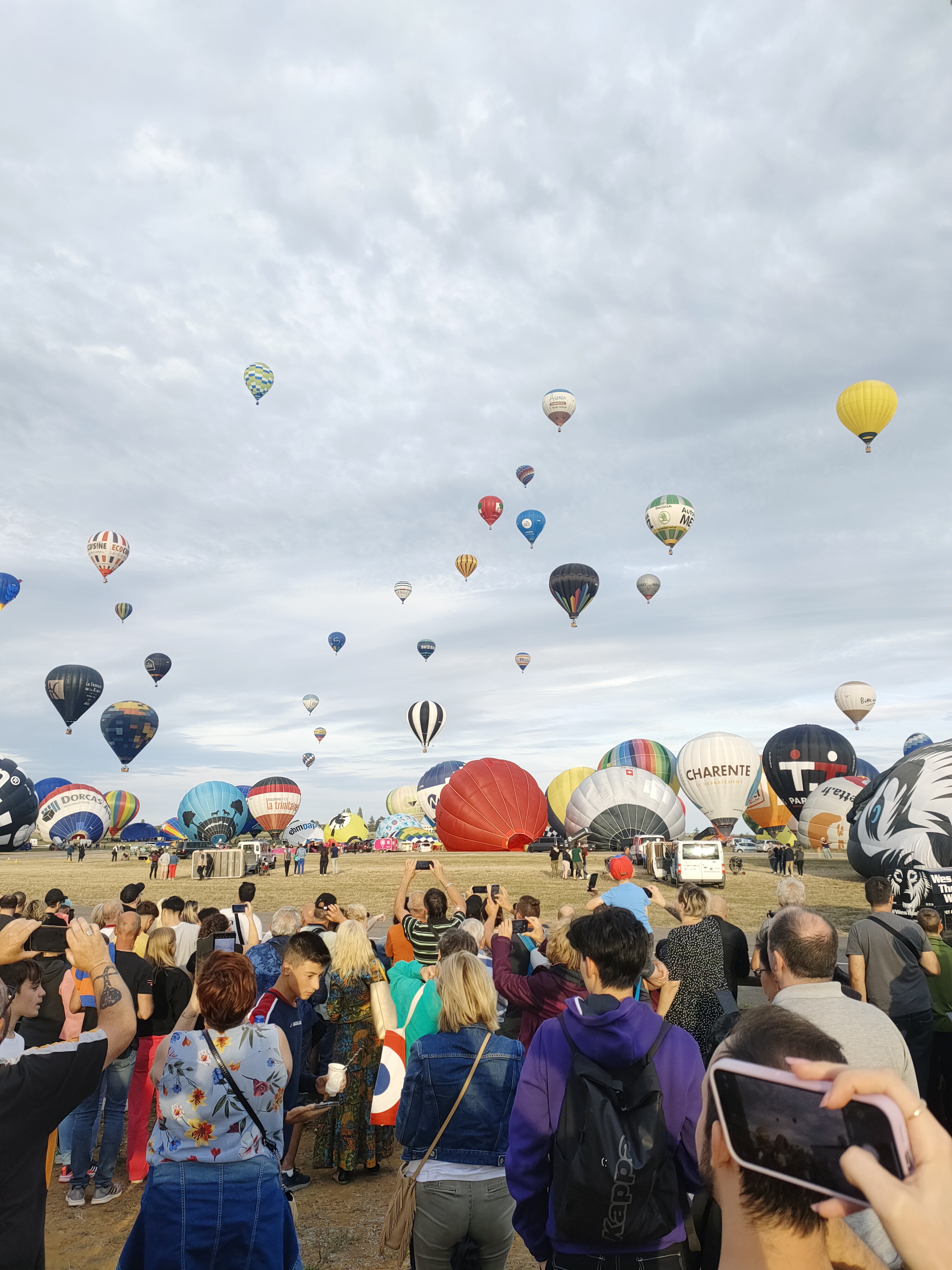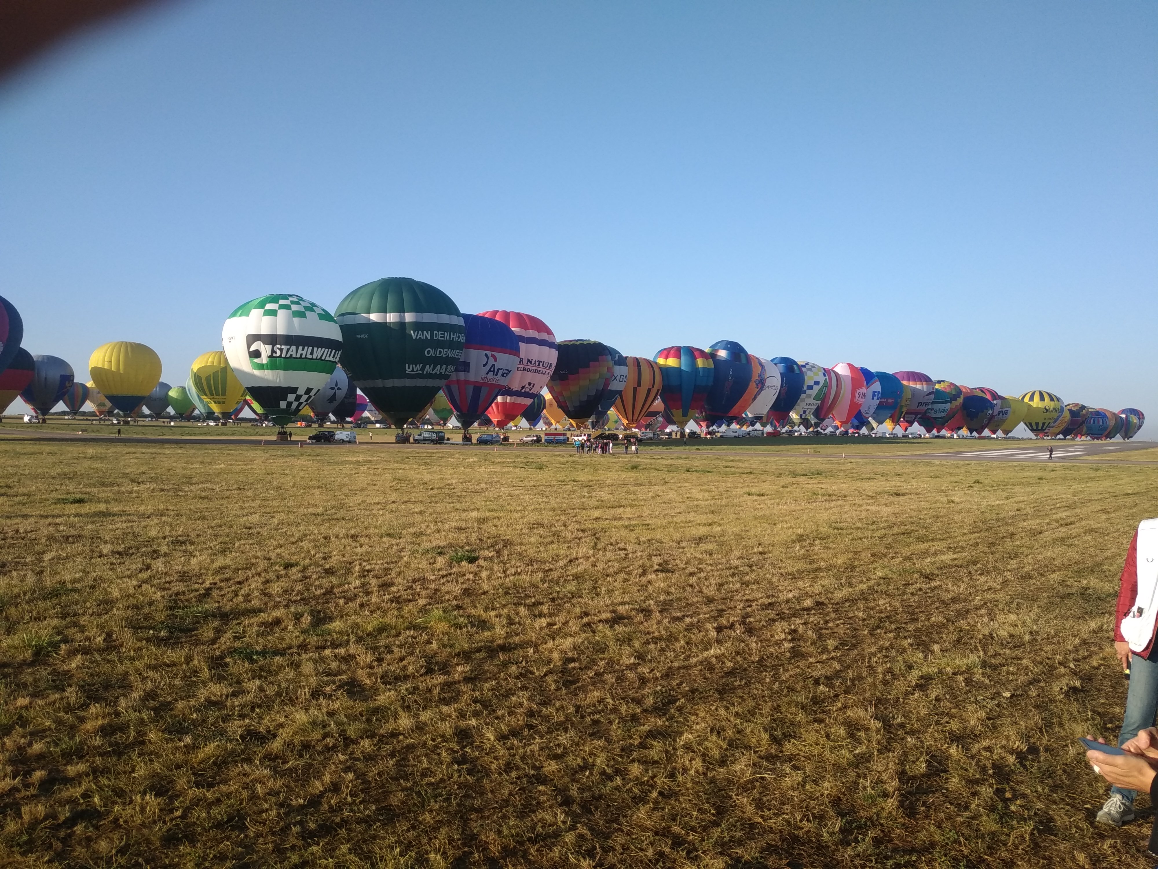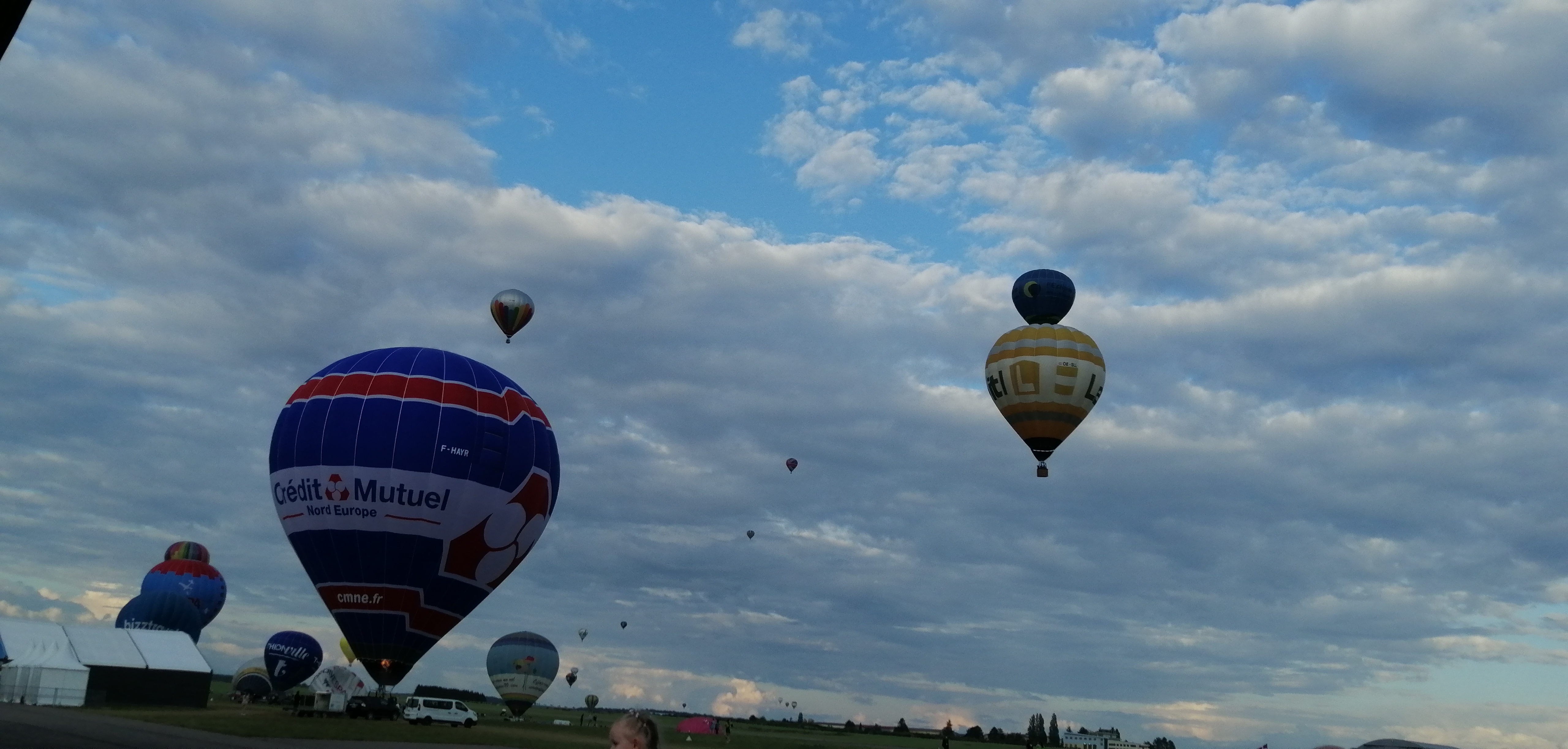 Beaucoup, beaucoup, beaucoup de monde pour aller voir un départ à 18h00. Environ 40 minutes de files de voitures pour voir l'entrée du site et se faire délester vers le parking sud par les gendarmes. Arrivé au parking sur des champs, 15 minutes de marche pour accéder à l'entrée qui lui est gratuit. Gratuit, mot qui temps à disparaître du vocabulaire Français. Le service d'ordre refuse les bouteilles de bières et autres bouteilles, mais ça passe quand même, car vérifier les sacs, les poussettes, les sacs à dos, les glacières. Pas chose facile. Reste à se placer sur les espaces encore libre devant la piste d'envol. Pas de chance, pas de départ faute à trop de vent, la foule se précipite pour sortir rapidement. Pas de chance, encore 1h00 pour sortir du parking principal. Le notre, personne, et les gendarmes sécurisés les sorties, bien. Restauration possible, wc public en nombres dispo, expo, mongolfière à doudou pour les enfants, bref, de quoi vous distraire. Merci aux organisateurs pour ce fabuleux évènement qui se tient tous les 2 ans. C'est un sacré boulot de tout prévoir, sauf la météo, là on subit.
