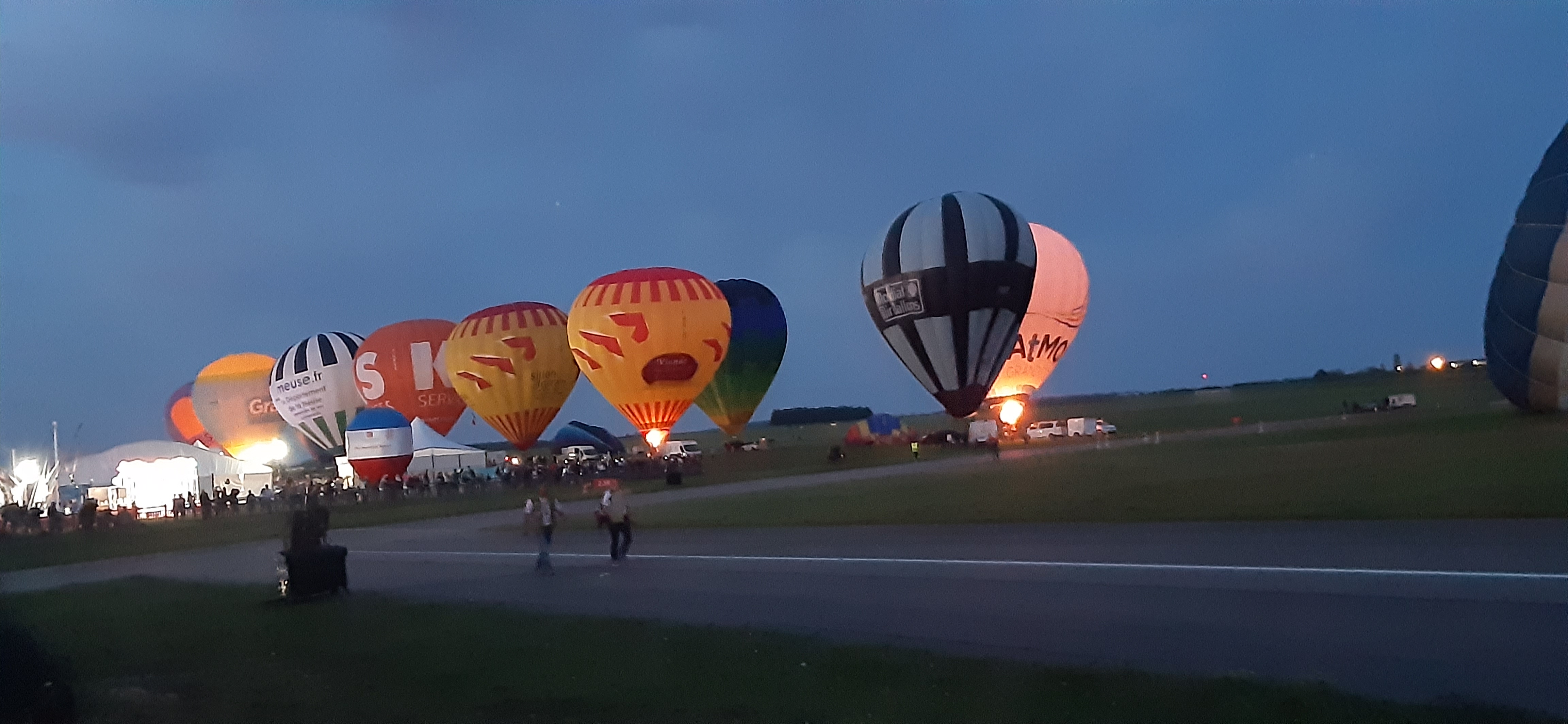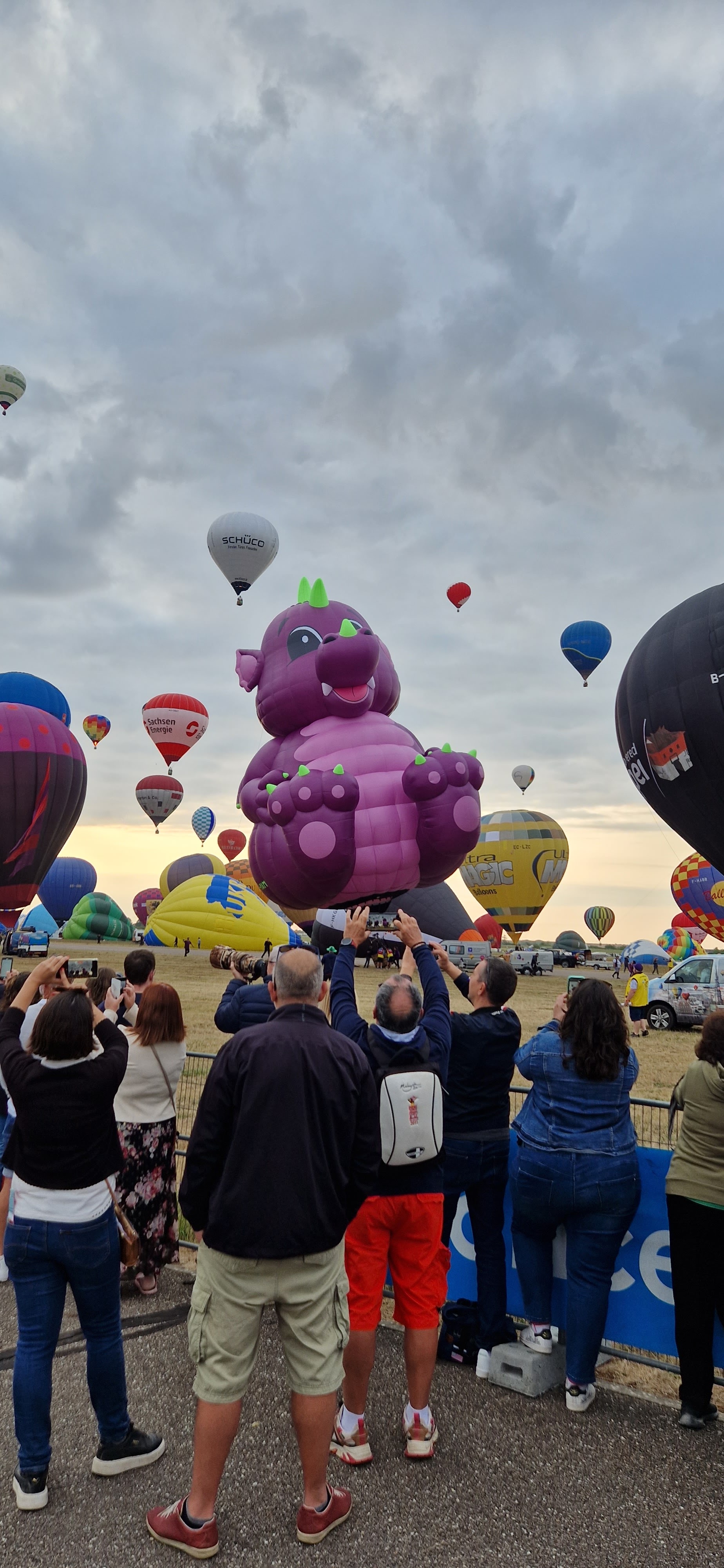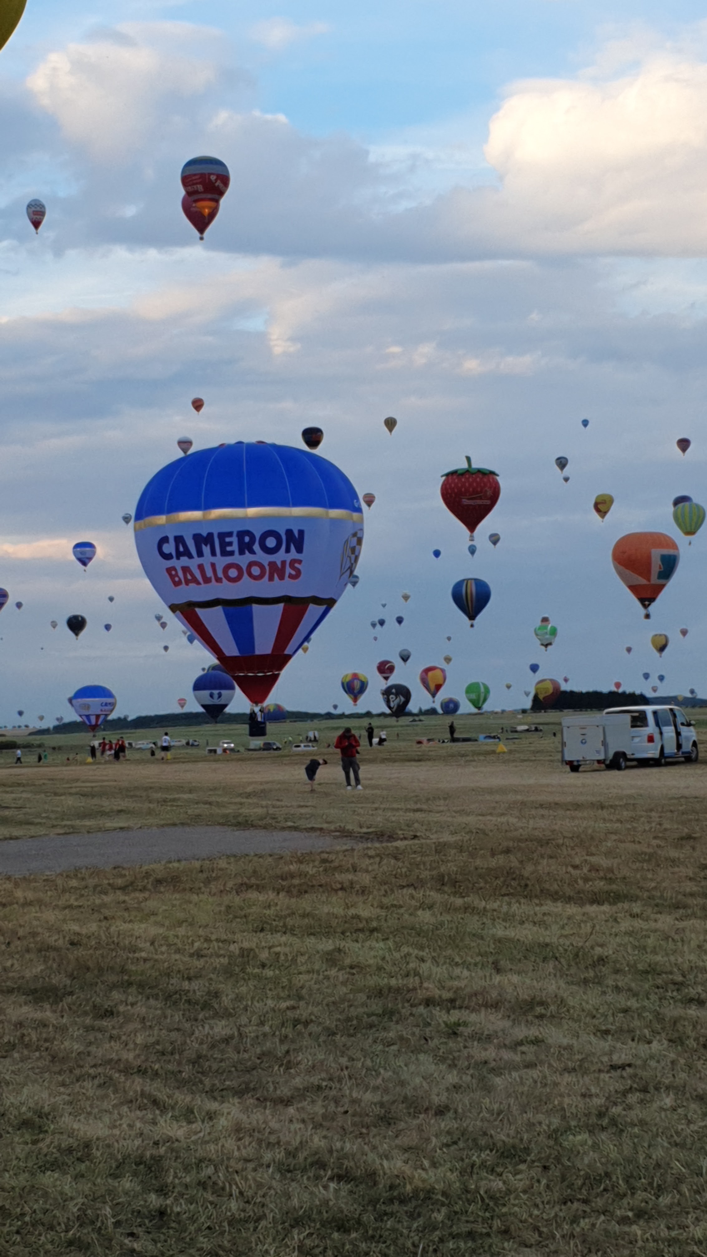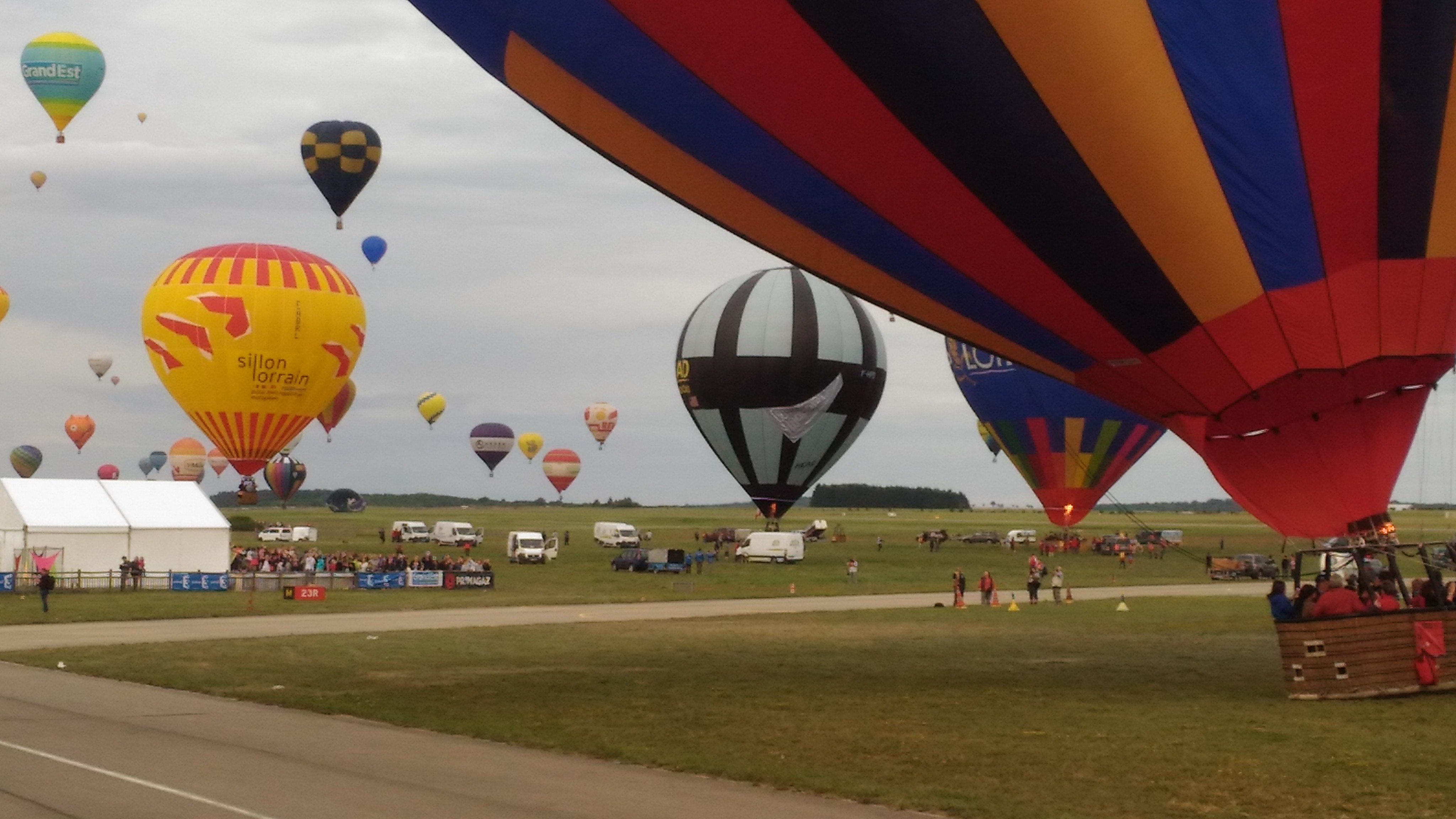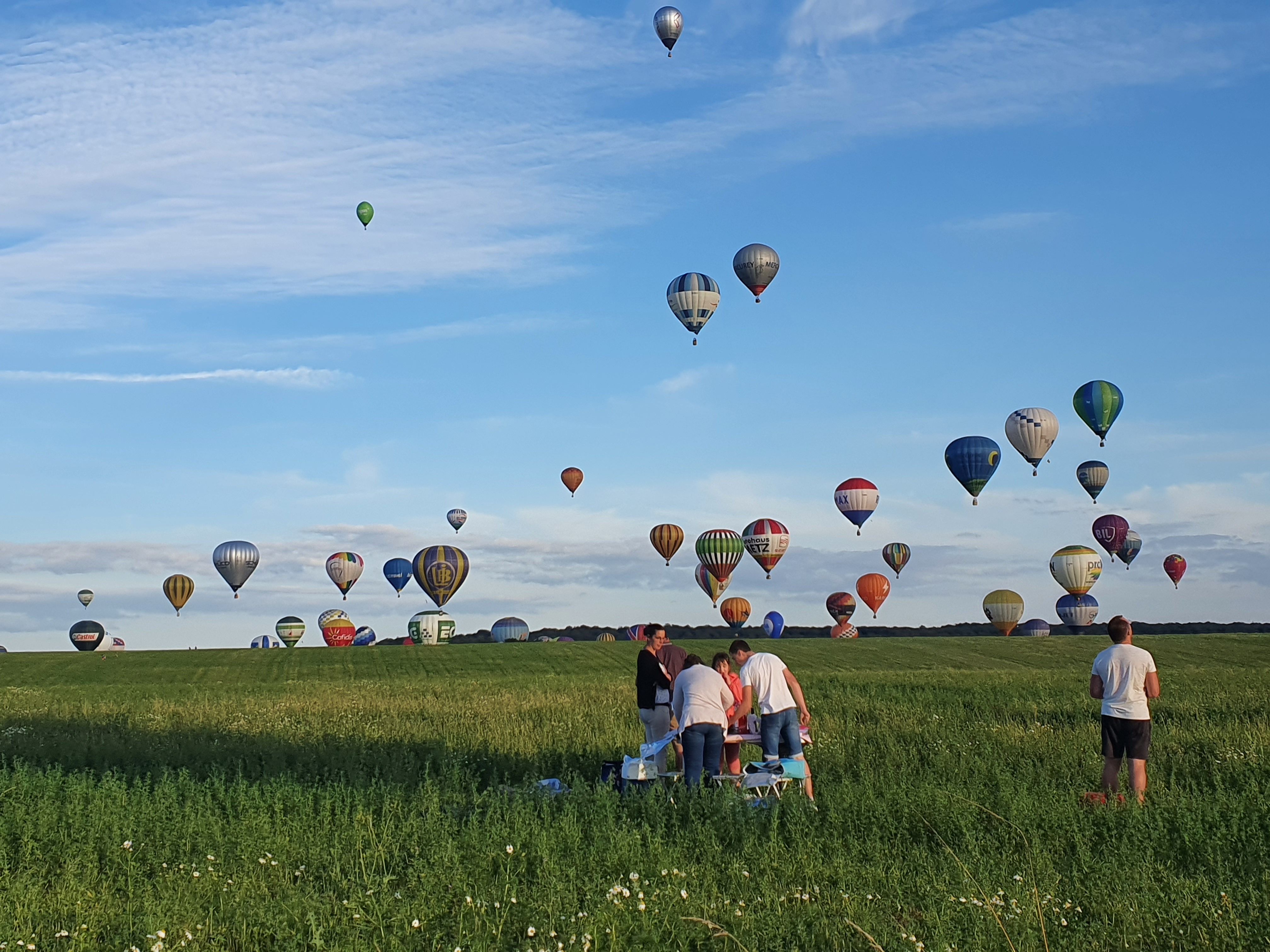 Beaucoup, beaucoup, beaucoup de monde pour aller voir un départ à 18h00. Environ 40 minutes de files de voitures pour voir l'entrée du site et se faire délester vers le parking sud par les gendarmes. Arrivé au parking sur des champs, 15 minutes de marche pour accéder à l'entrée qui lui est gratuit. Gratuit, mot qui temps à disparaître du vocabulaire Français. Le service d'ordre refuse les bouteilles de bières et autres bouteilles, mais ça passe quand même, car vérifier les sacs, les poussettes, les sacs à dos, les glacières. Pas chose facile. Reste à se placer sur les espaces encore libre devant la piste d'envol. Pas de chance, pas de départ faute à trop de vent, la foule se précipite pour sortir rapidement. Pas de chance, encore 1h00 pour sortir du parking principal. Le notre, personne, et les gendarmes sécurisés les sorties, bien. Restauration possible, wc public en nombres dispo, expo, mongolfière à doudou pour les enfants, bref, de quoi vous distraire. Merci aux organisateurs pour ce fabuleux évènement qui se tient tous les 2 ans. C'est un sacré boulot de tout prévoir, sauf la météo, là on subit.