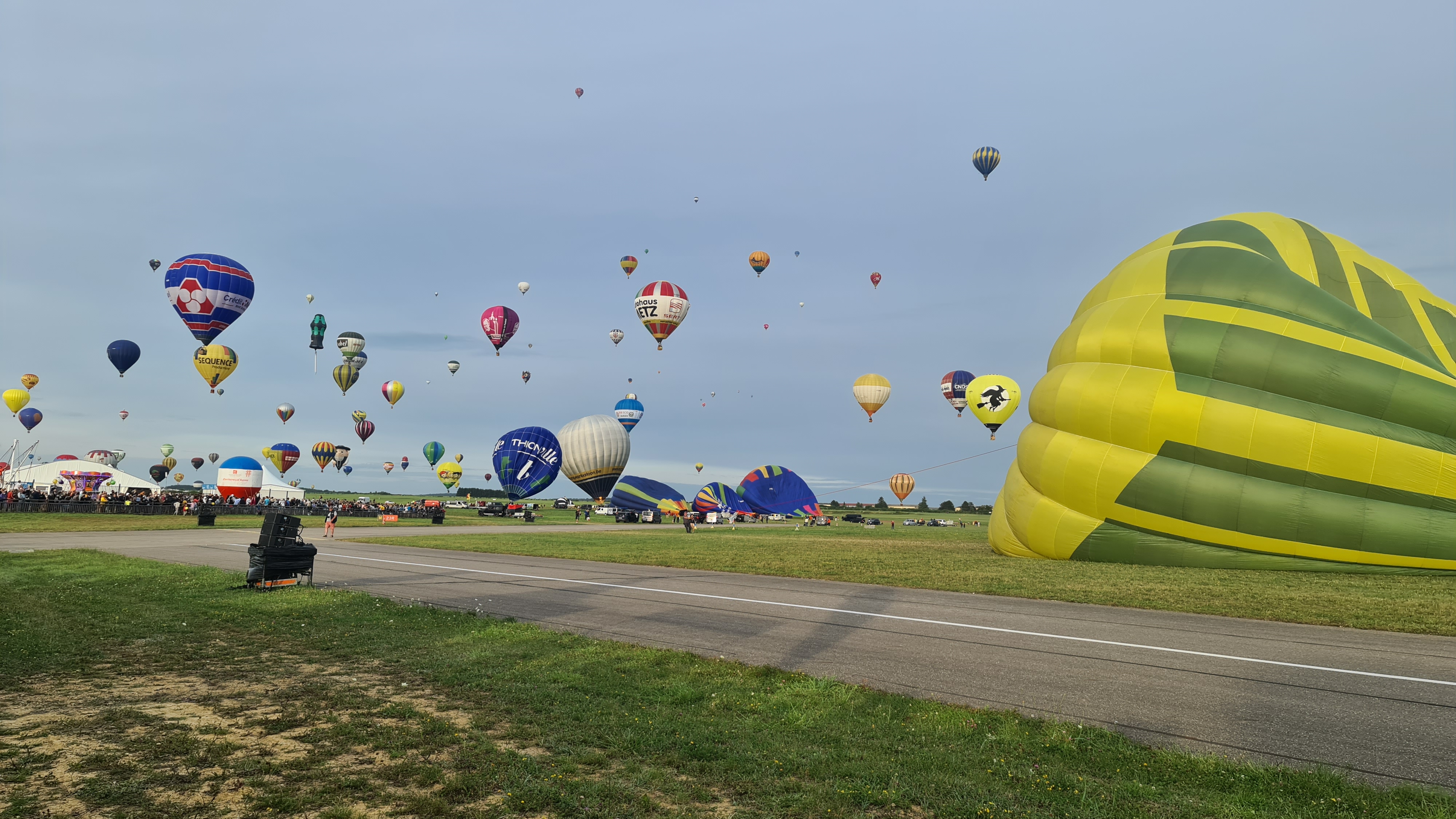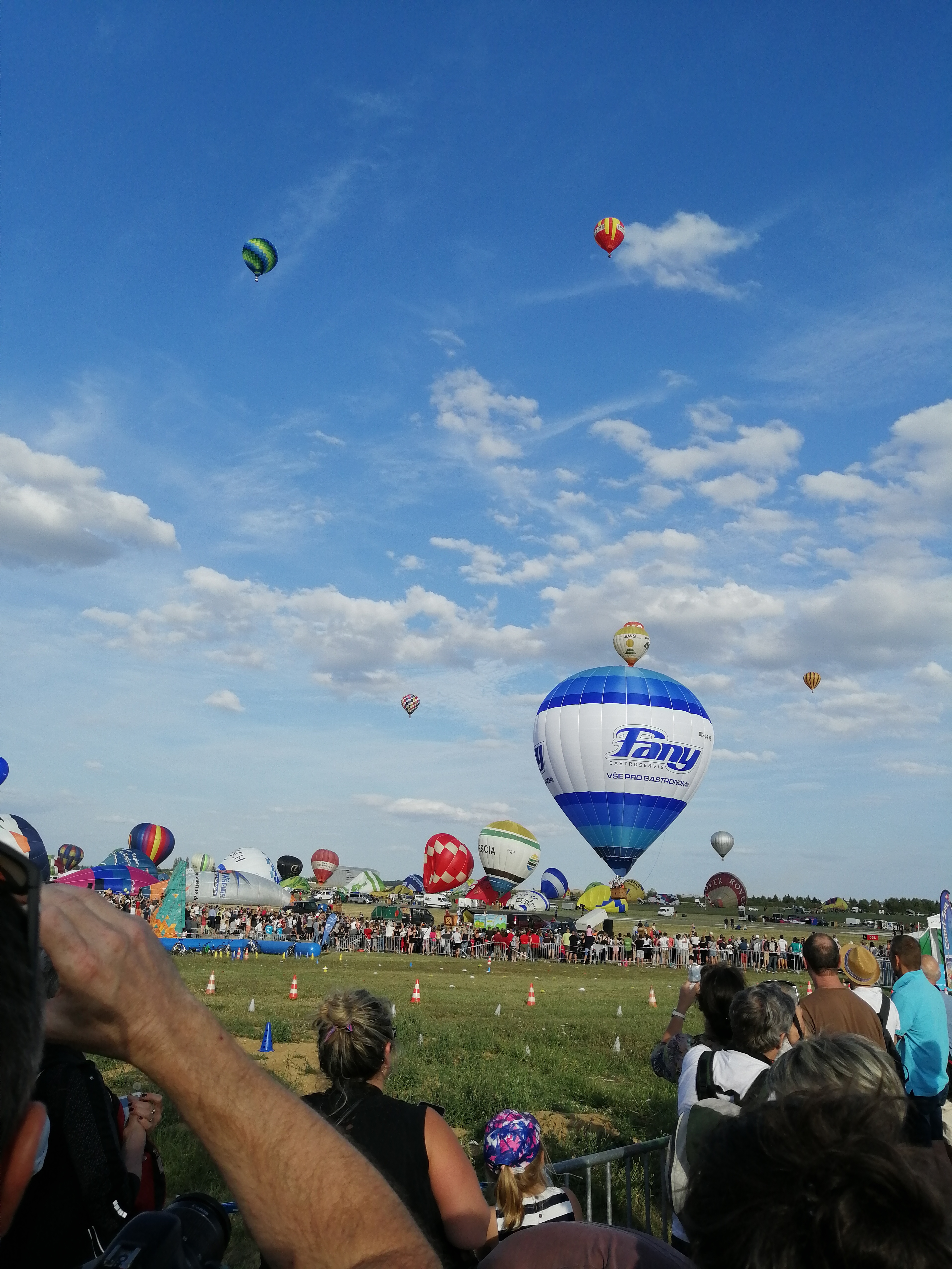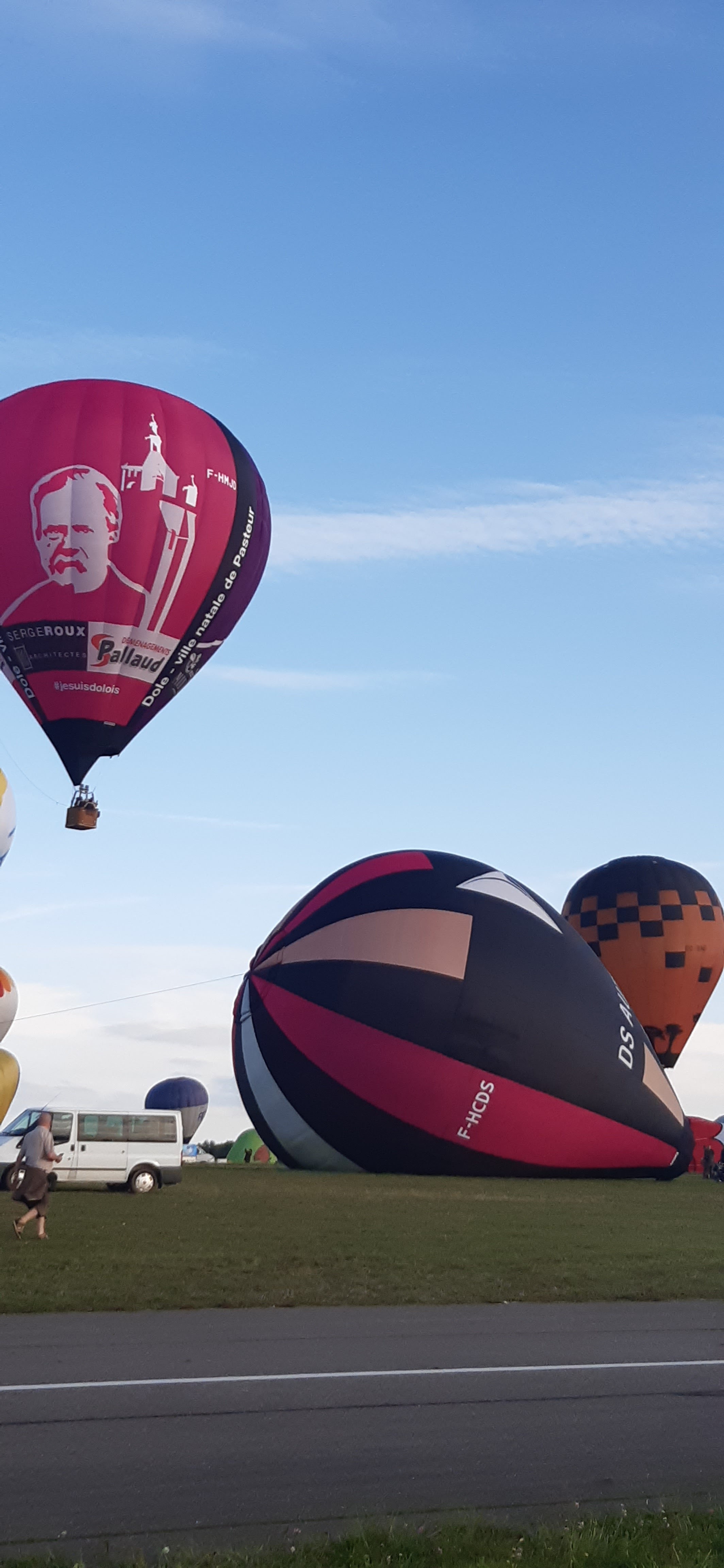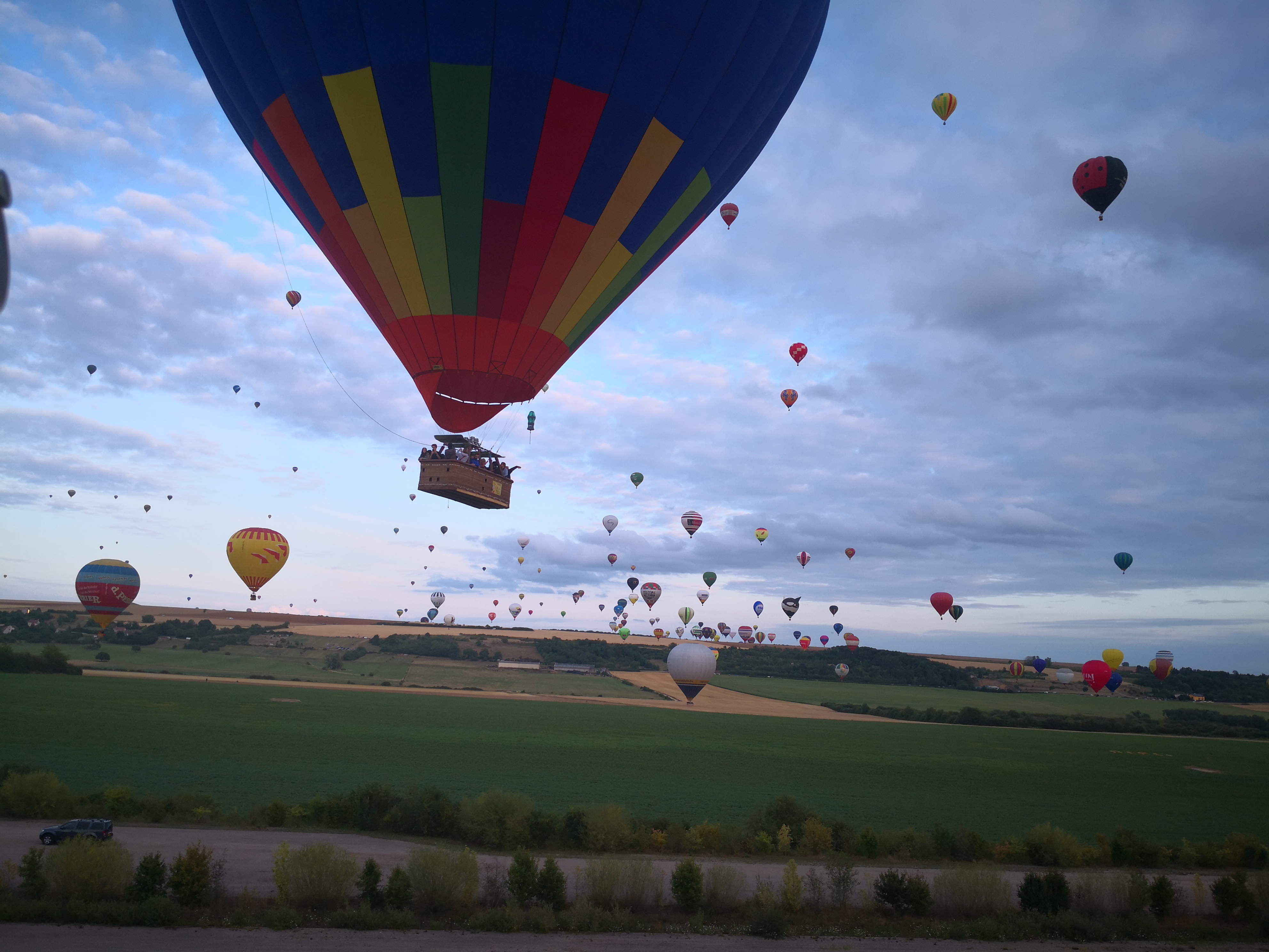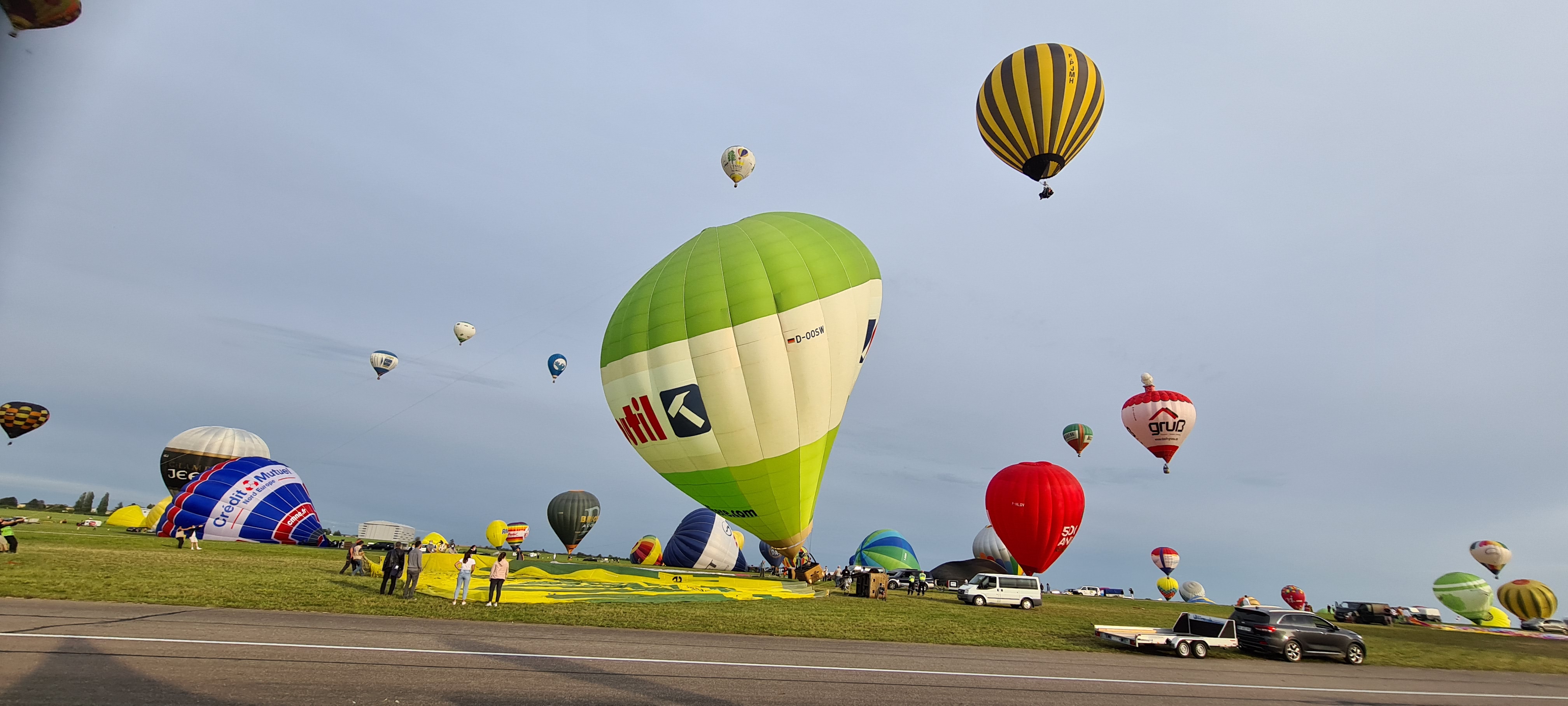 Beaucoup, beaucoup, beaucoup de monde pour aller voir un départ à 18h00. Environ 40 minutes de files de voitures pour voir l'entrée du site et se faire délester vers le parking sud par les gendarmes. Arrivé au parking sur des champs, 15 minutes de marche pour accéder à l'entrée qui lui est gratuit. Gratuit, mot qui temps à disparaître du vocabulaire Français. Le service d'ordre refuse les bouteilles de bières et autres bouteilles, mais ça passe quand même, car vérifier les sacs, les poussettes, les sacs à dos, les glacières. Pas chose facile. Reste à se placer sur les espaces encore libre devant la piste d'envol. Pas de chance, pas de départ faute à trop de vent, la foule se précipite pour sortir rapidement. Pas de chance, encore 1h00 pour sortir du parking principal. Le notre, personne, et les gendarmes sécurisés les sorties, bien. Restauration possible, wc public en nombres dispo, expo, mongolfière à doudou pour les enfants, bref, de quoi vous distraire. Merci aux organisateurs pour ce fabuleux évènement qui se tient tous les 2 ans. C'est un sacré boulot de tout prévoir, sauf la météo, là on subit.