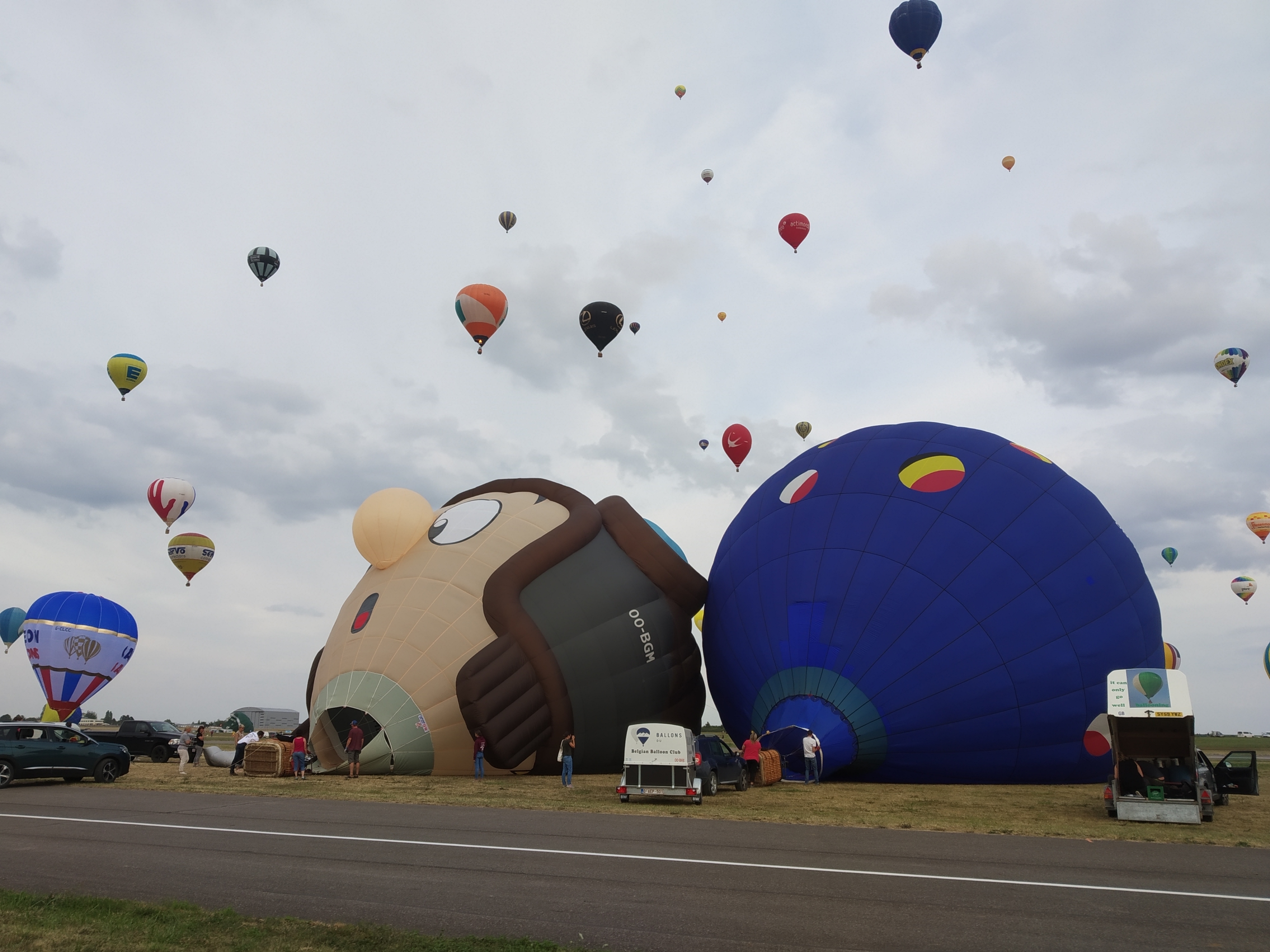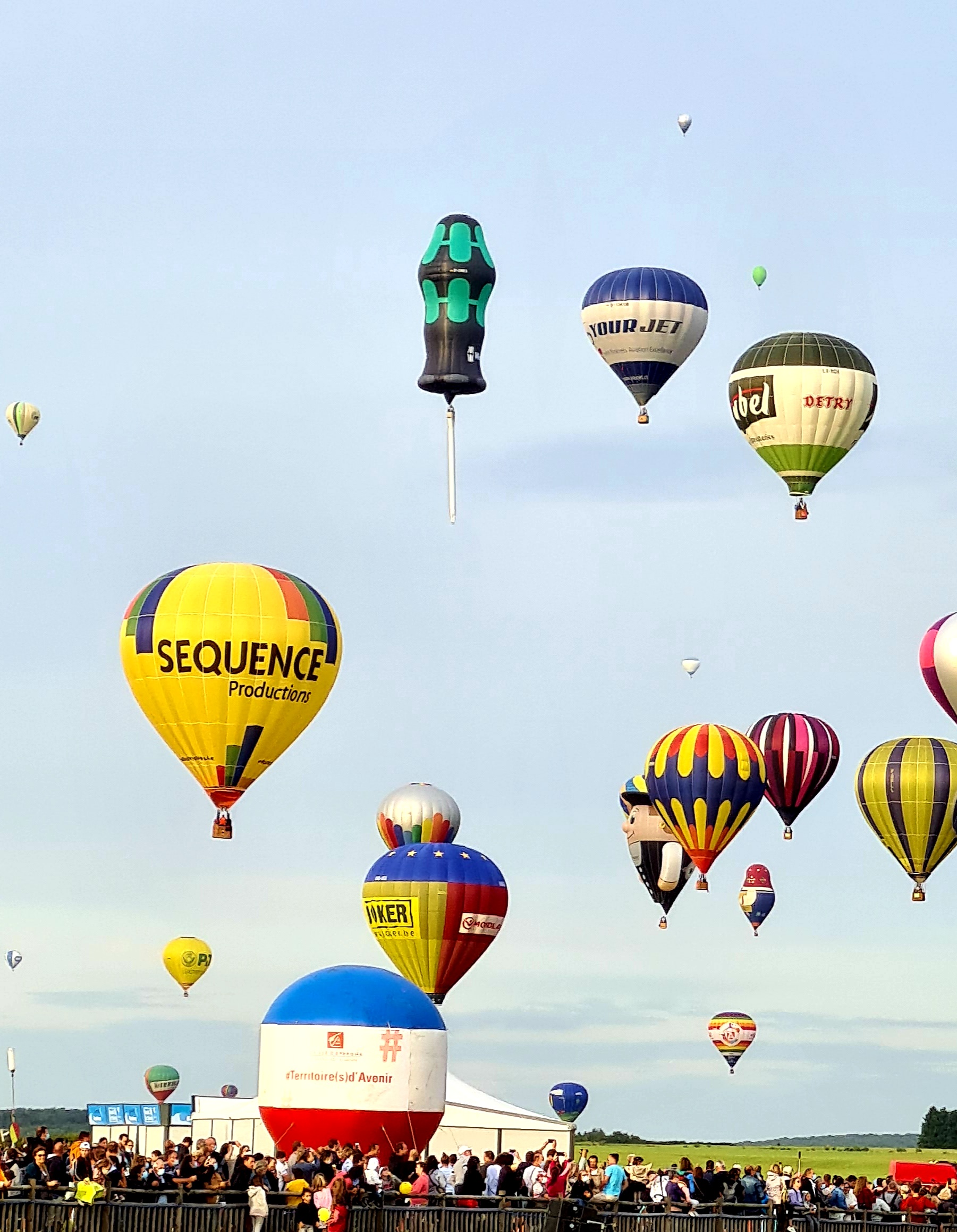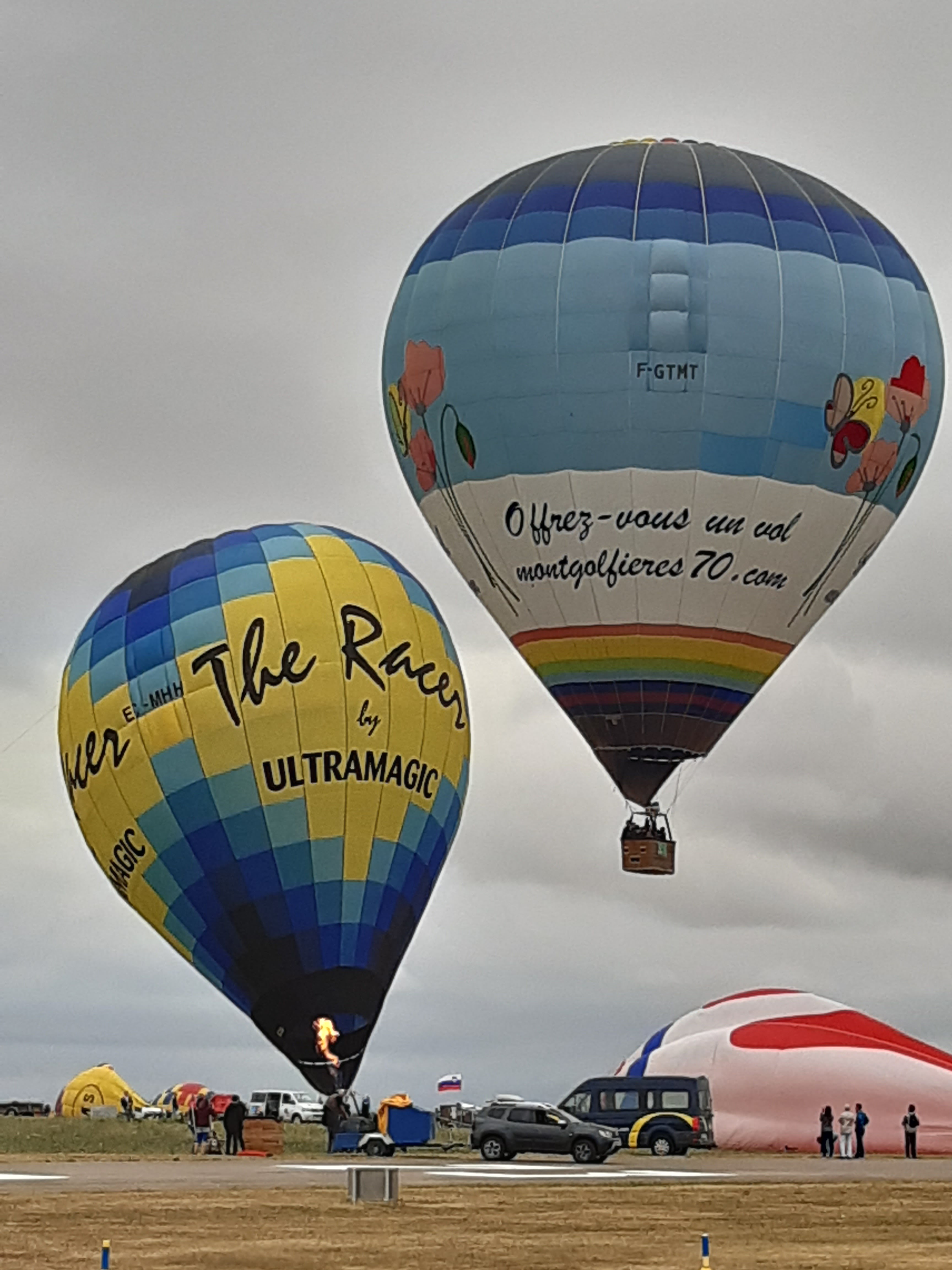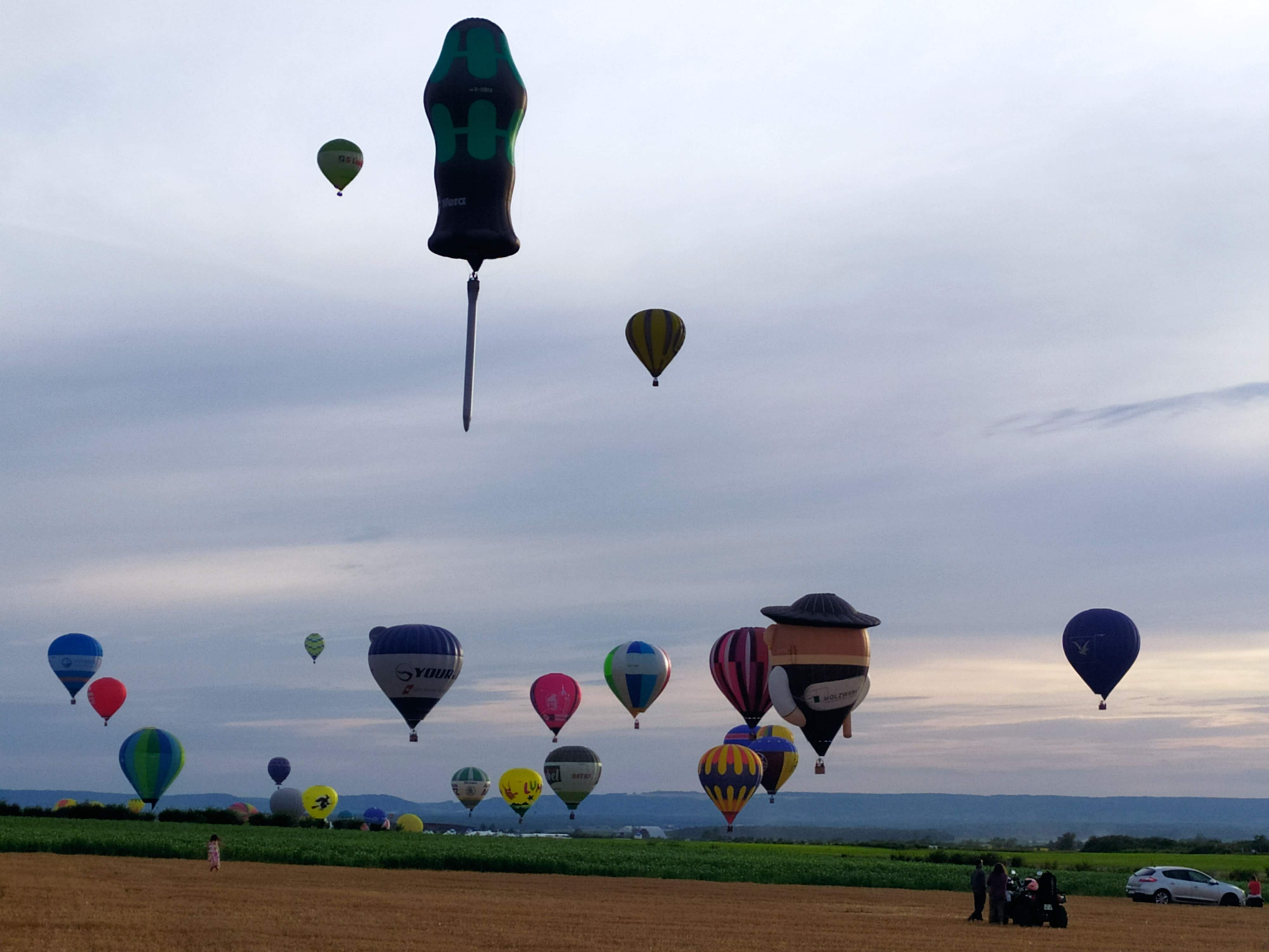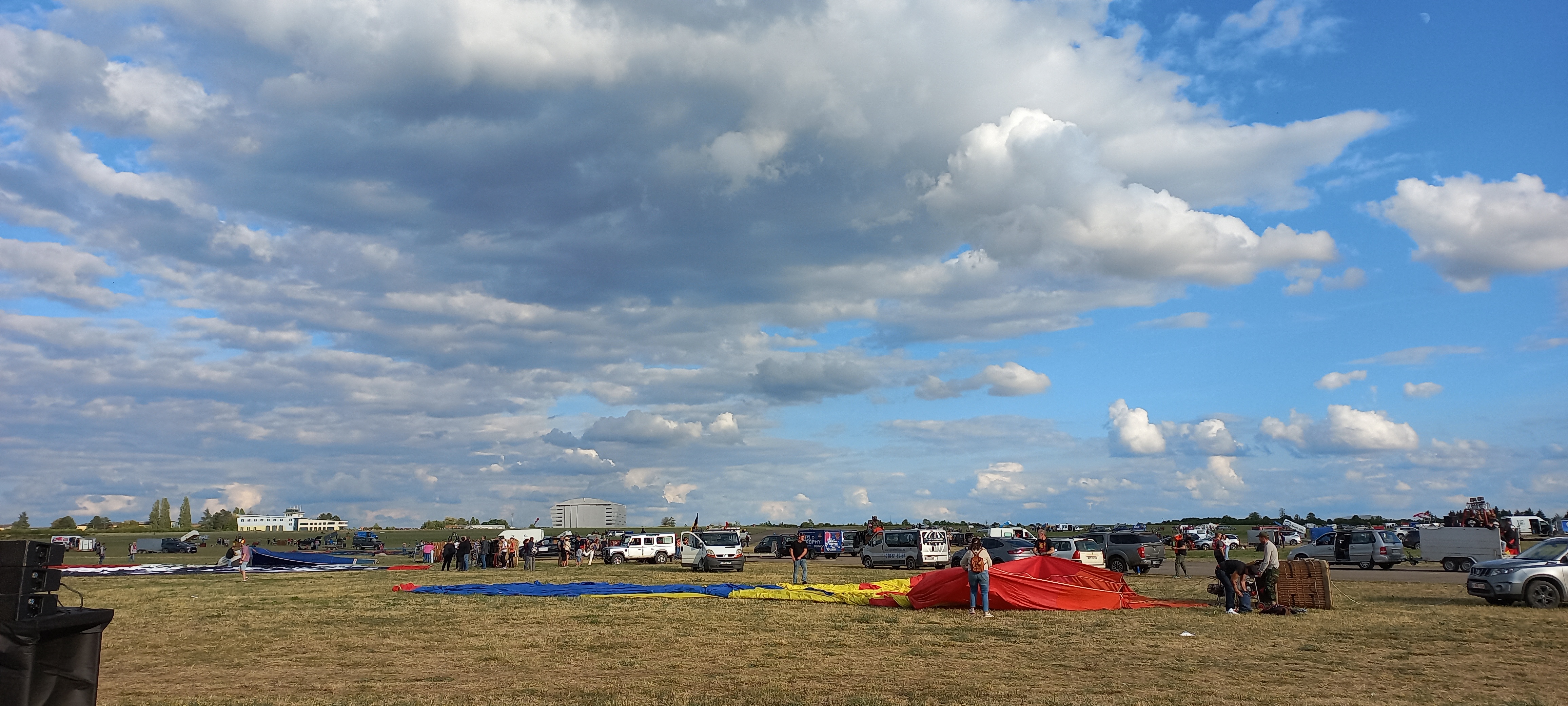 Beaucoup, beaucoup, beaucoup de monde pour aller voir un départ à 18h00. Environ 40 minutes de files de voitures pour voir l'entrée du site et se faire délester vers le parking sud par les gendarmes. Arrivé au parking sur des champs, 15 minutes de marche pour accéder à l'entrée qui lui est gratuit. Gratuit, mot qui temps à disparaître du vocabulaire Français. Le service d'ordre refuse les bouteilles de bières et autres bouteilles, mais ça passe quand même, car vérifier les sacs, les poussettes, les sacs à dos, les glacières. Pas chose facile. Reste à se placer sur les espaces encore libre devant la piste d'envol. Pas de chance, pas de départ faute à trop de vent, la foule se précipite pour sortir rapidement. Pas de chance, encore 1h00 pour sortir du parking principal. Le notre, personne, et les gendarmes sécurisés les sorties, bien. Restauration possible, wc public en nombres dispo, expo, mongolfière à doudou pour les enfants, bref, de quoi vous distraire. Merci aux organisateurs pour ce fabuleux évènement qui se tient tous les 2 ans. C'est un sacré boulot de tout prévoir, sauf la météo, là on subit.