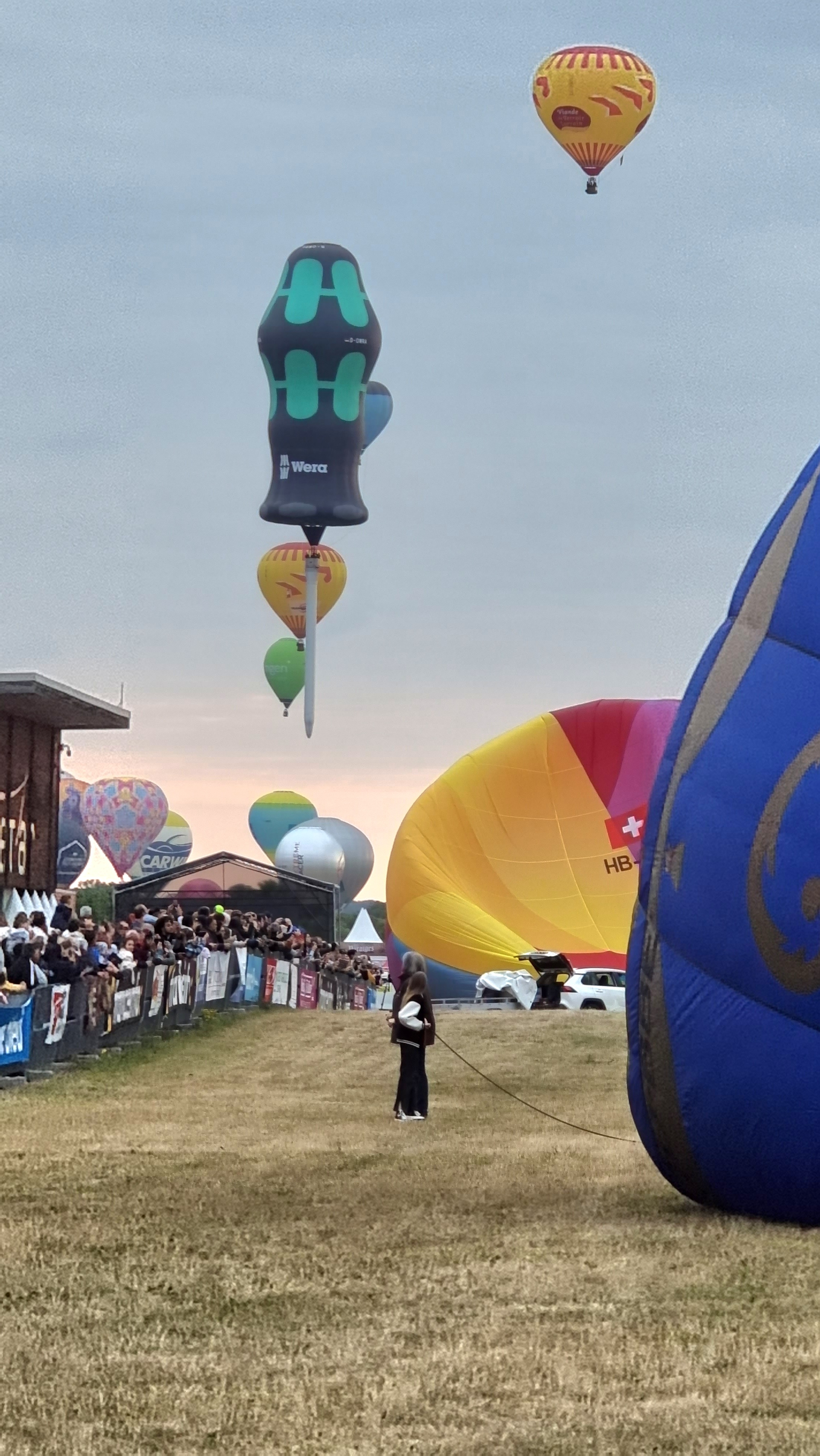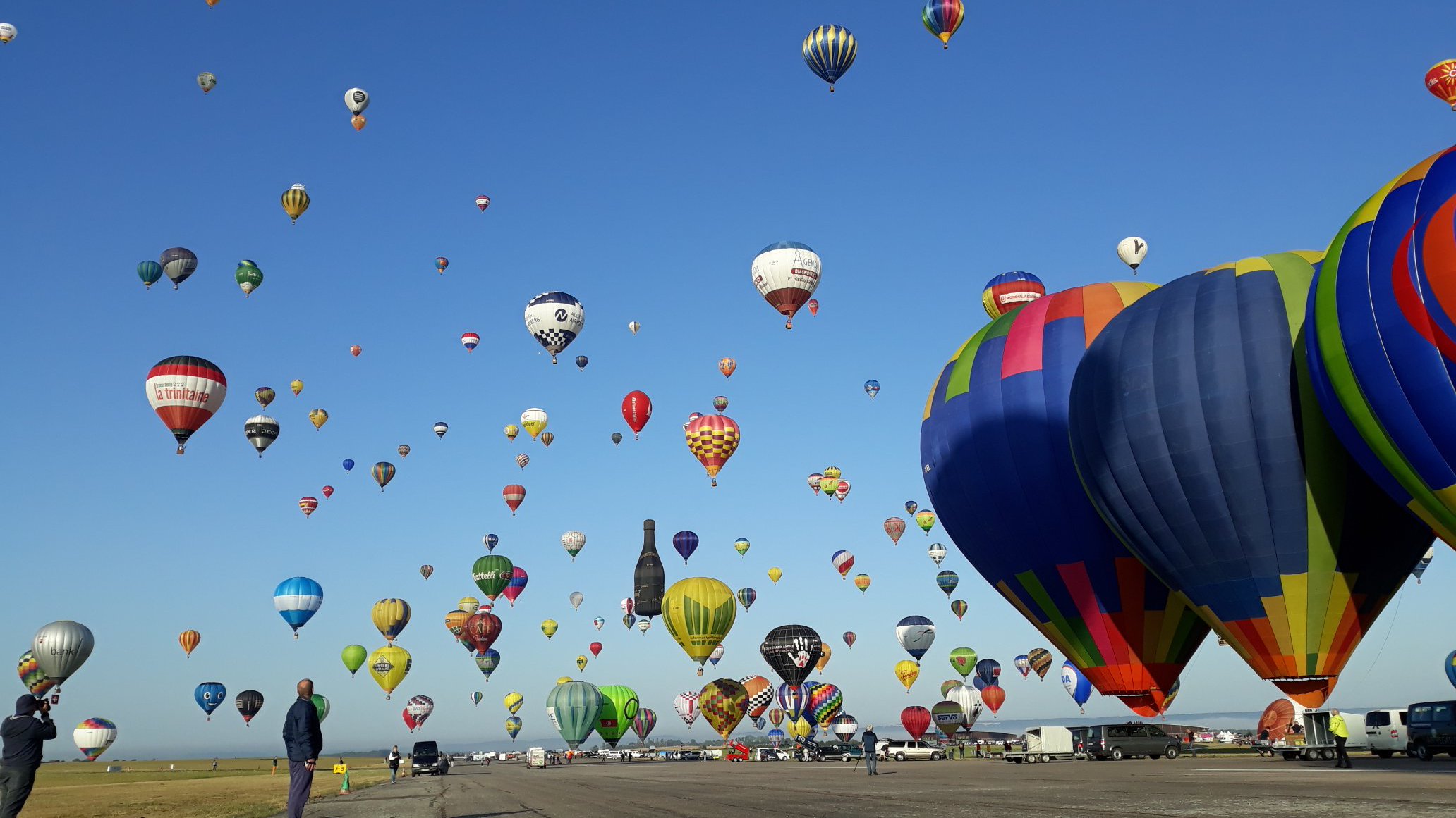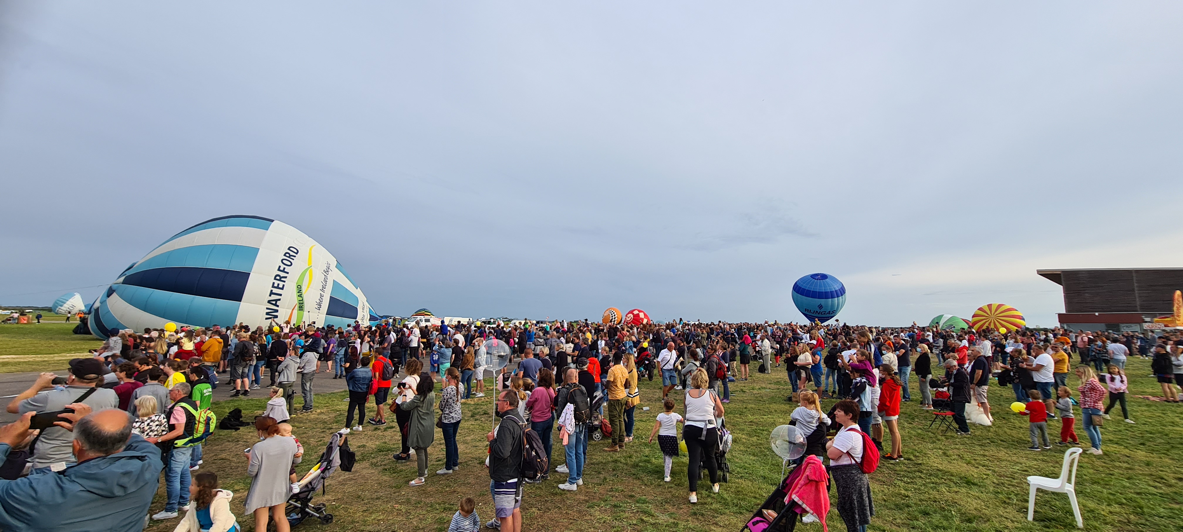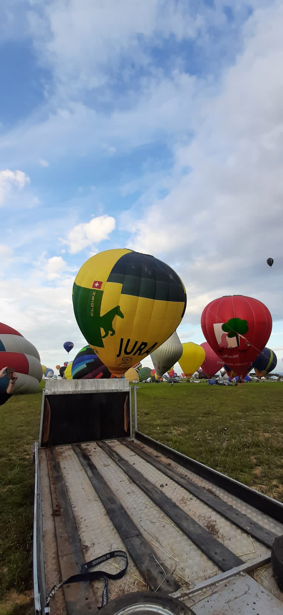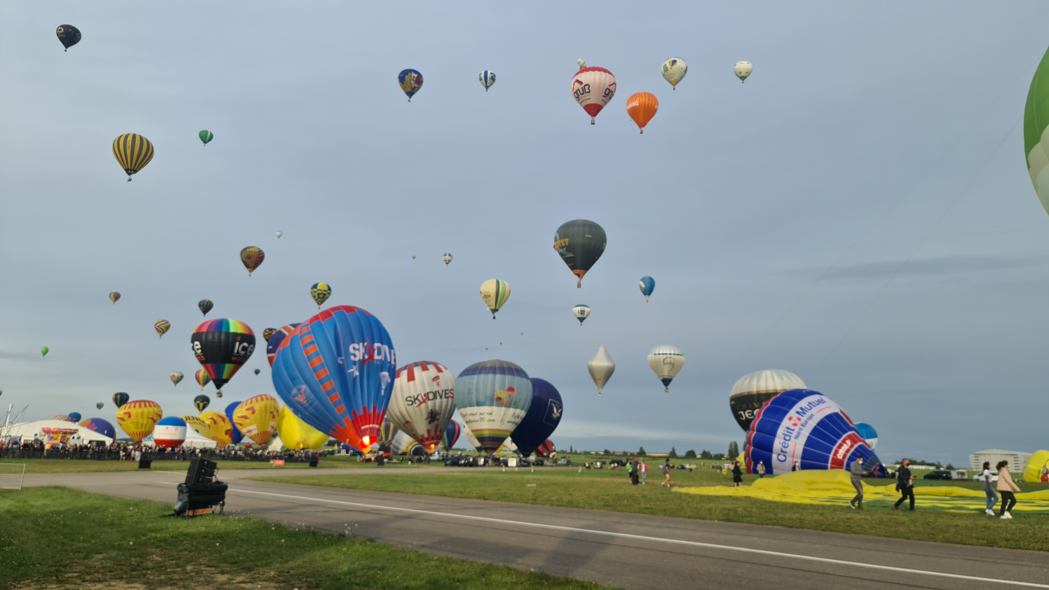 Beaucoup, beaucoup, beaucoup de monde pour aller voir un départ à 18h00. Environ 40 minutes de files de voitures pour voir l'entrée du site et se faire délester vers le parking sud par les gendarmes. Arrivé au parking sur des champs, 15 minutes de marche pour accéder à l'entrée qui lui est gratuit. Gratuit, mot qui temps à disparaître du vocabulaire Français. Le service d'ordre refuse les bouteilles de bières et autres bouteilles, mais ça passe quand même, car vérifier les sacs, les poussettes, les sacs à dos, les glacières. Pas chose facile. Reste à se placer sur les espaces encore libre devant la piste d'envol. Pas de chance, pas de départ faute à trop de vent, la foule se précipite pour sortir rapidement. Pas de chance, encore 1h00 pour sortir du parking principal. Le notre, personne, et les gendarmes sécurisés les sorties, bien. Restauration possible, wc public en nombres dispo, expo, mongolfière à doudou pour les enfants, bref, de quoi vous distraire. Merci aux organisateurs pour ce fabuleux évènement qui se tient tous les 2 ans. C'est un sacré boulot de tout prévoir, sauf la météo, là on subit.