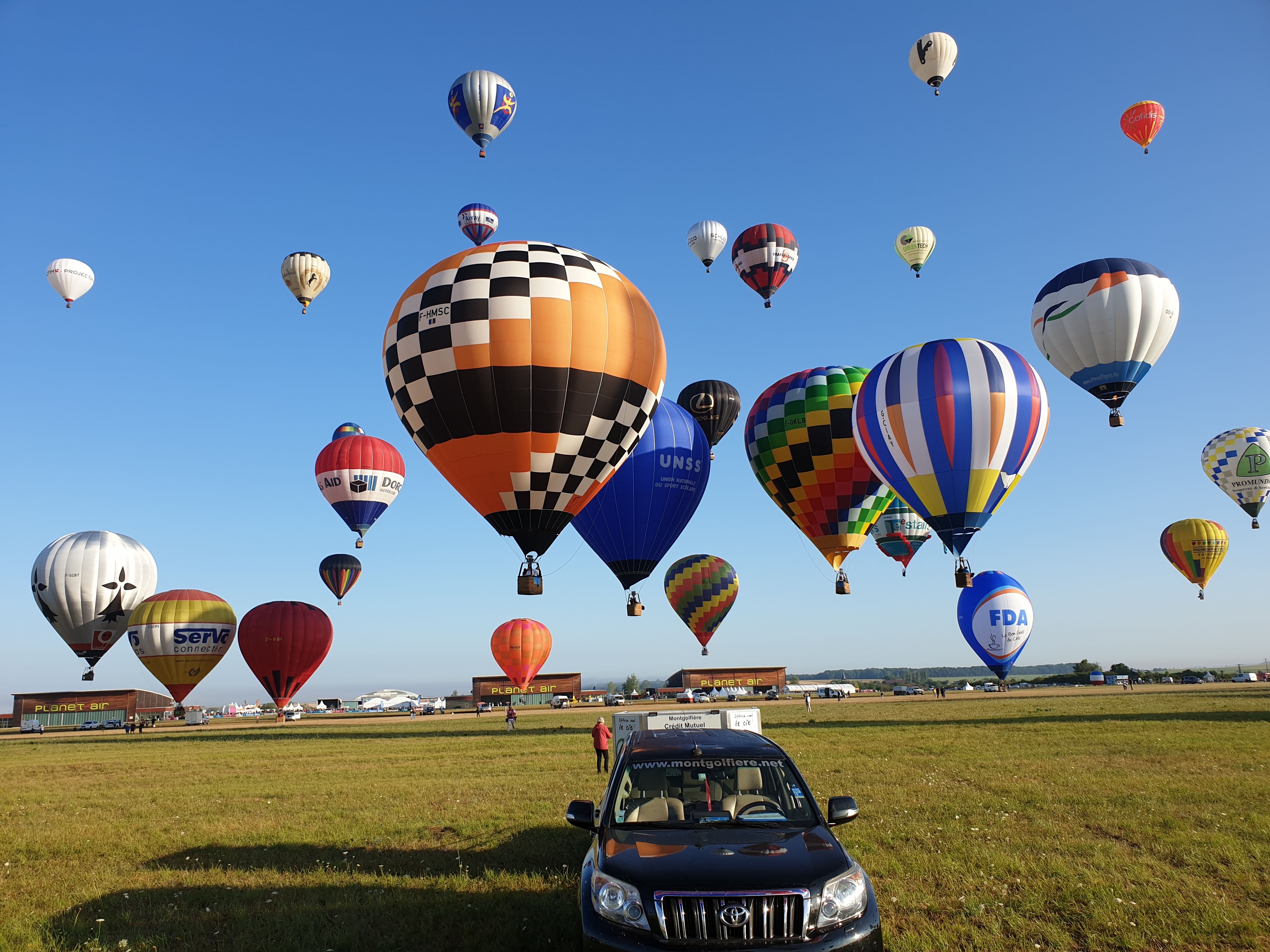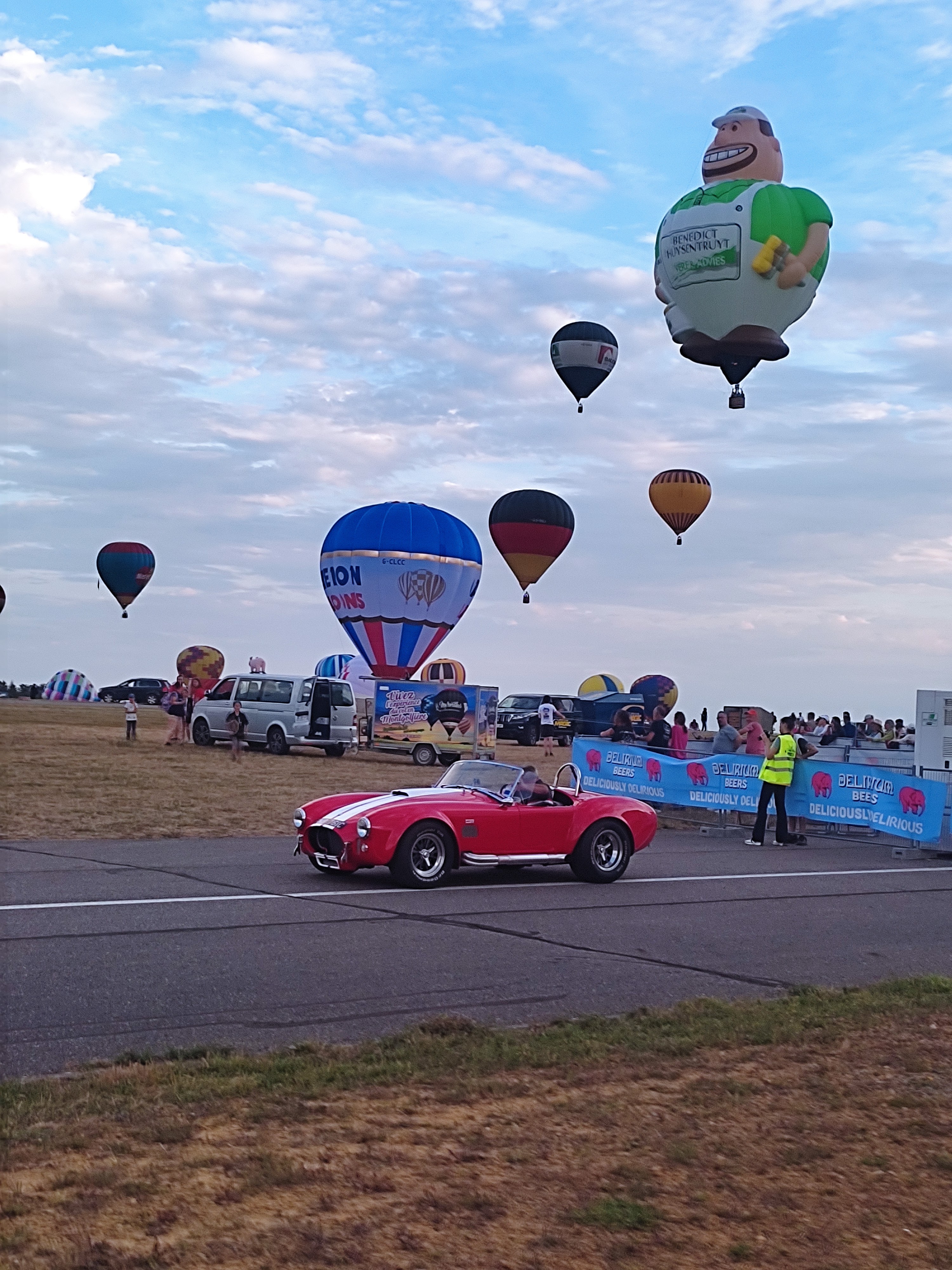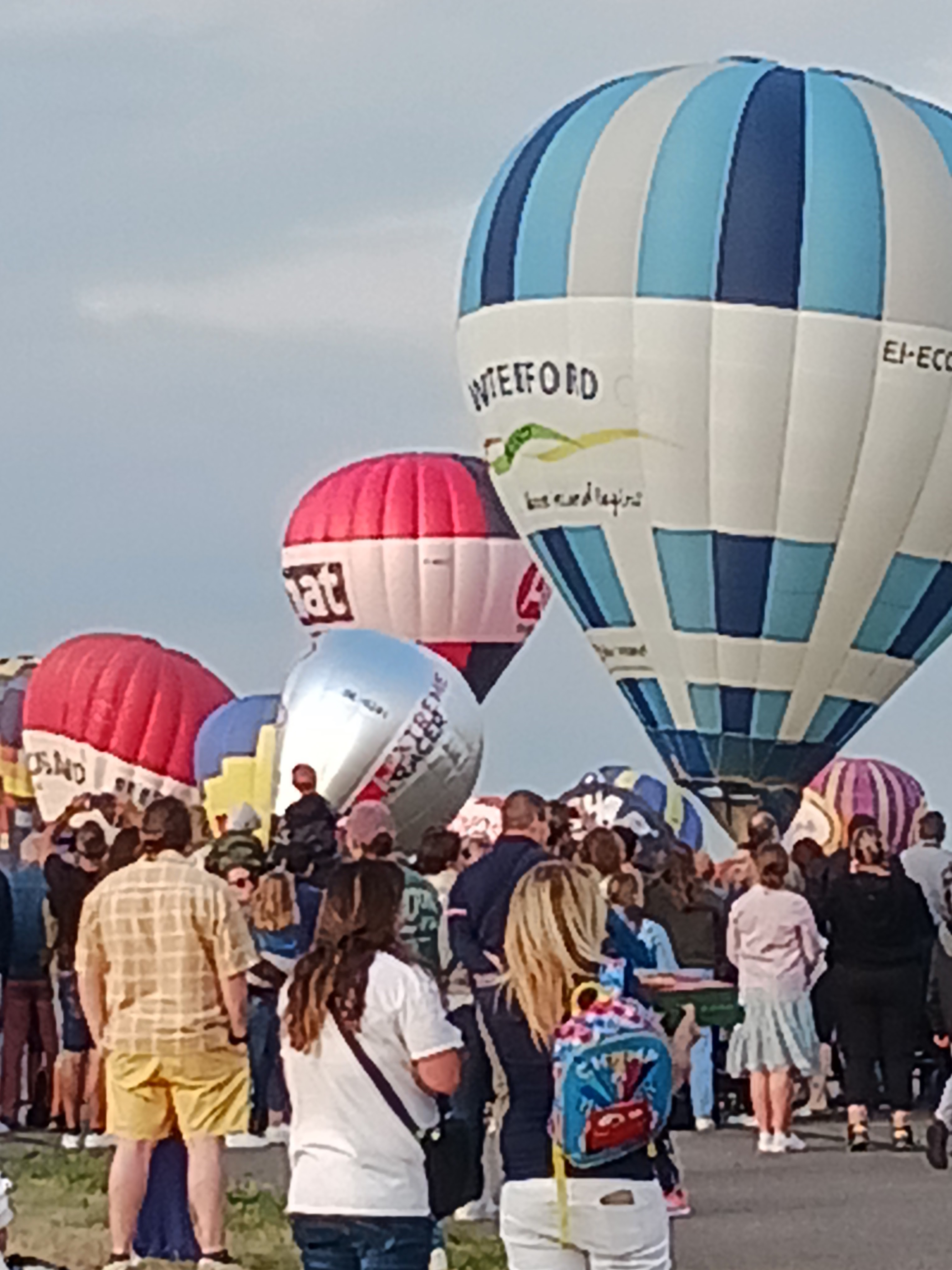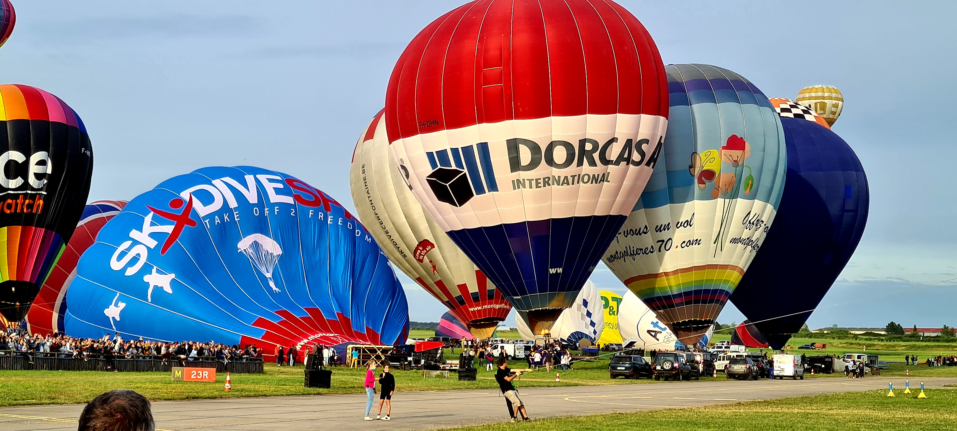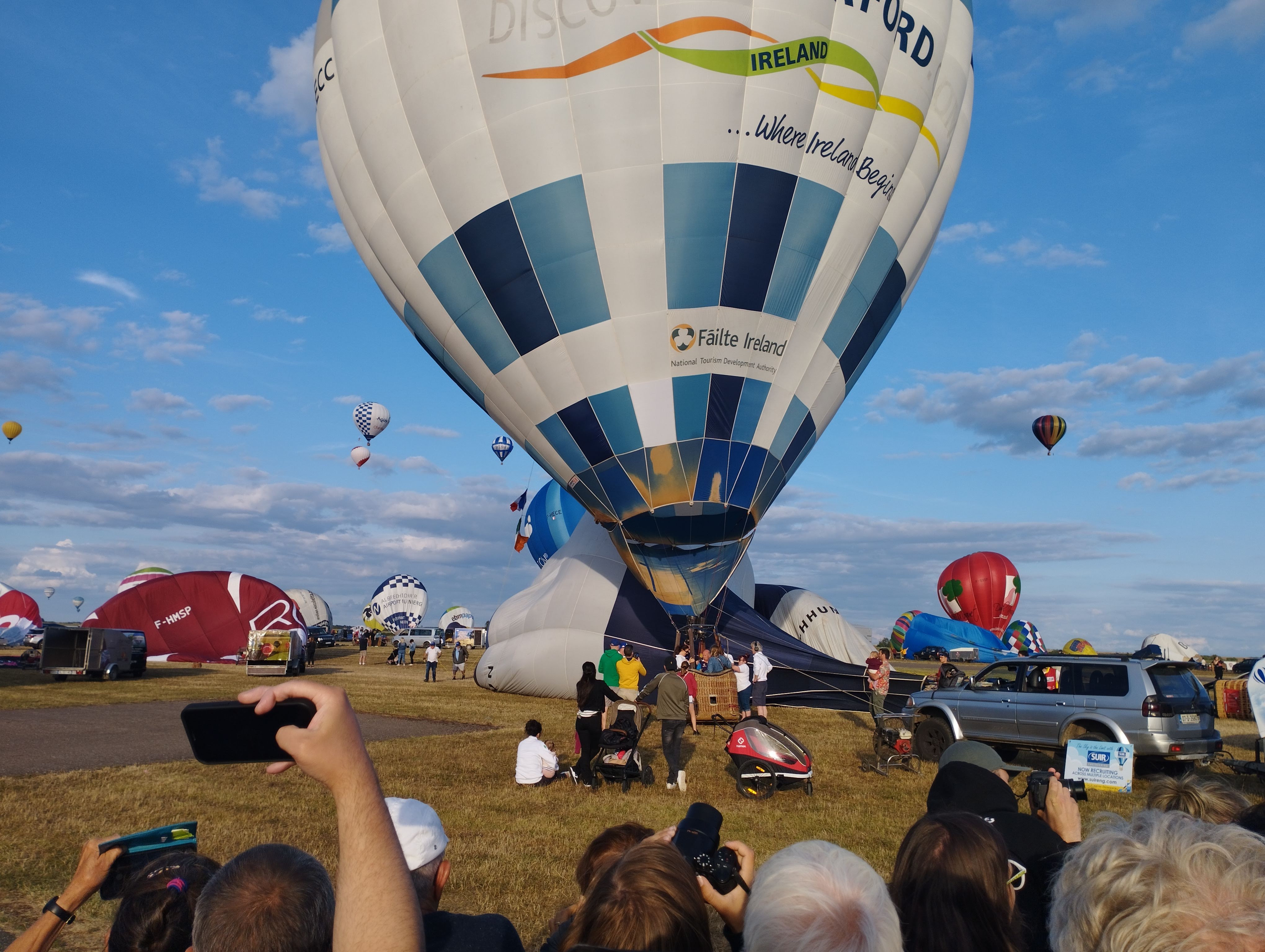 Beaucoup, beaucoup, beaucoup de monde pour aller voir un départ à 18h00. Environ 40 minutes de files de voitures pour voir l'entrée du site et se faire délester vers le parking sud par les gendarmes. Arrivé au parking sur des champs, 15 minutes de marche pour accéder à l'entrée qui lui est gratuit. Gratuit, mot qui temps à disparaître du vocabulaire Français. Le service d'ordre refuse les bouteilles de bières et autres bouteilles, mais ça passe quand même, car vérifier les sacs, les poussettes, les sacs à dos, les glacières. Pas chose facile. Reste à se placer sur les espaces encore libre devant la piste d'envol. Pas de chance, pas de départ faute à trop de vent, la foule se précipite pour sortir rapidement. Pas de chance, encore 1h00 pour sortir du parking principal. Le notre, personne, et les gendarmes sécurisés les sorties, bien. Restauration possible, wc public en nombres dispo, expo, mongolfière à doudou pour les enfants, bref, de quoi vous distraire. Merci aux organisateurs pour ce fabuleux évènement qui se tient tous les 2 ans. C'est un sacré boulot de tout prévoir, sauf la météo, là on subit.