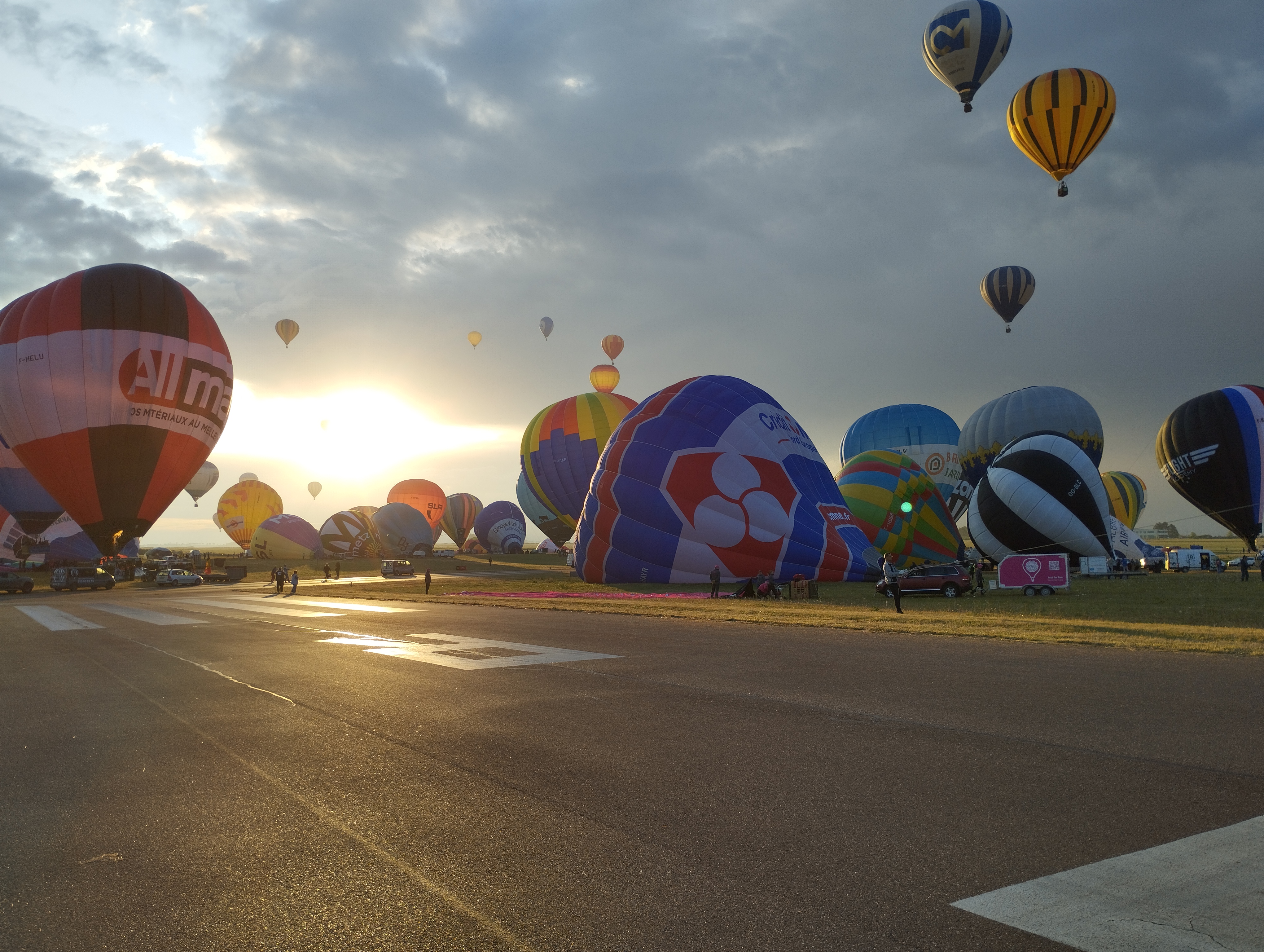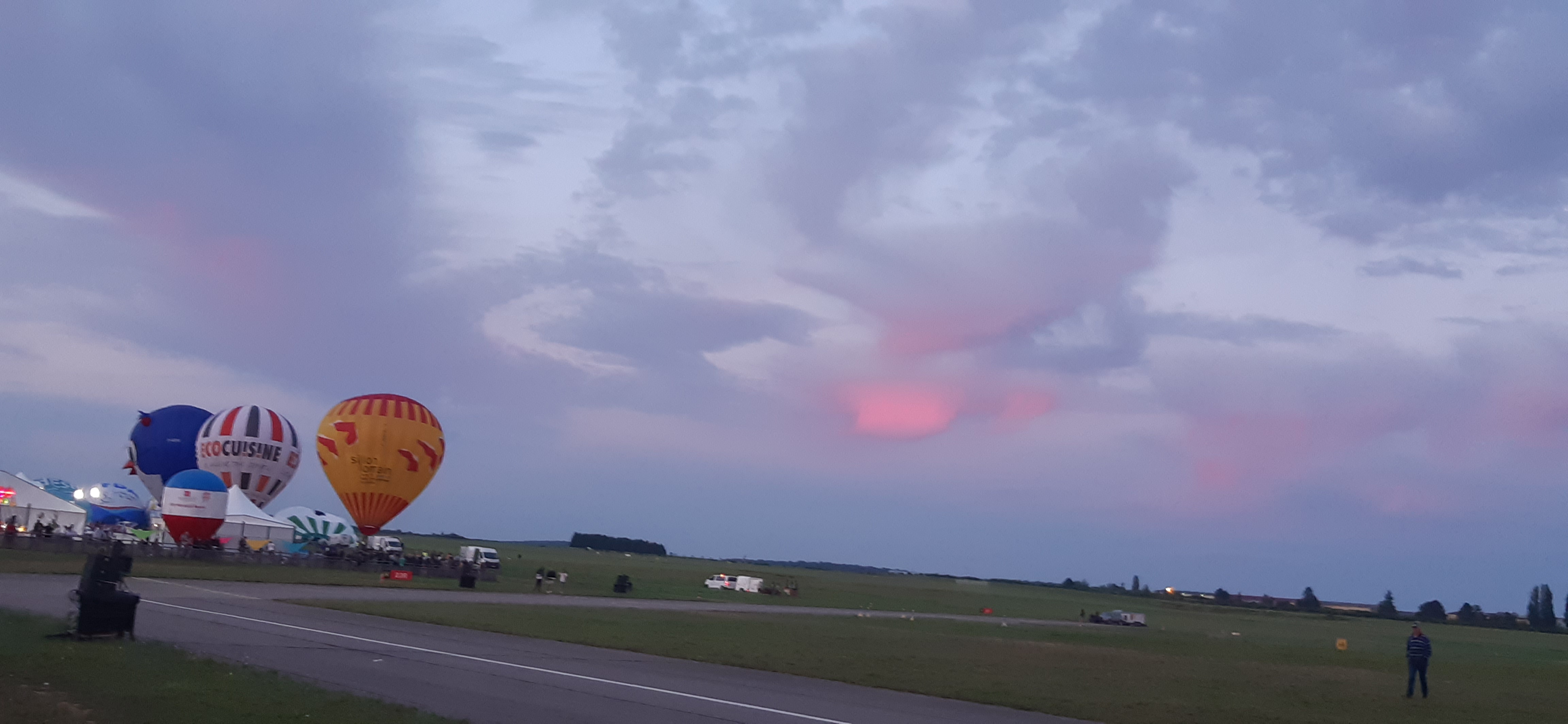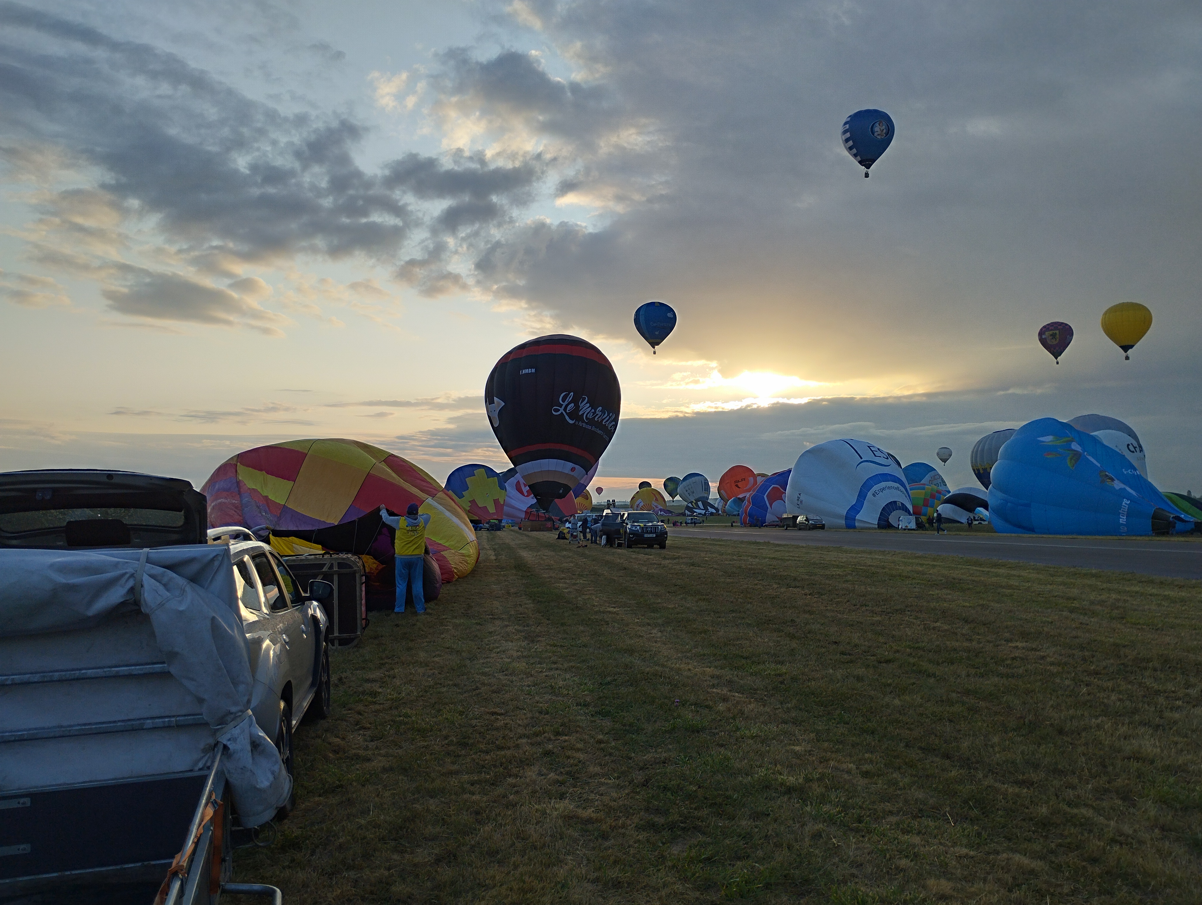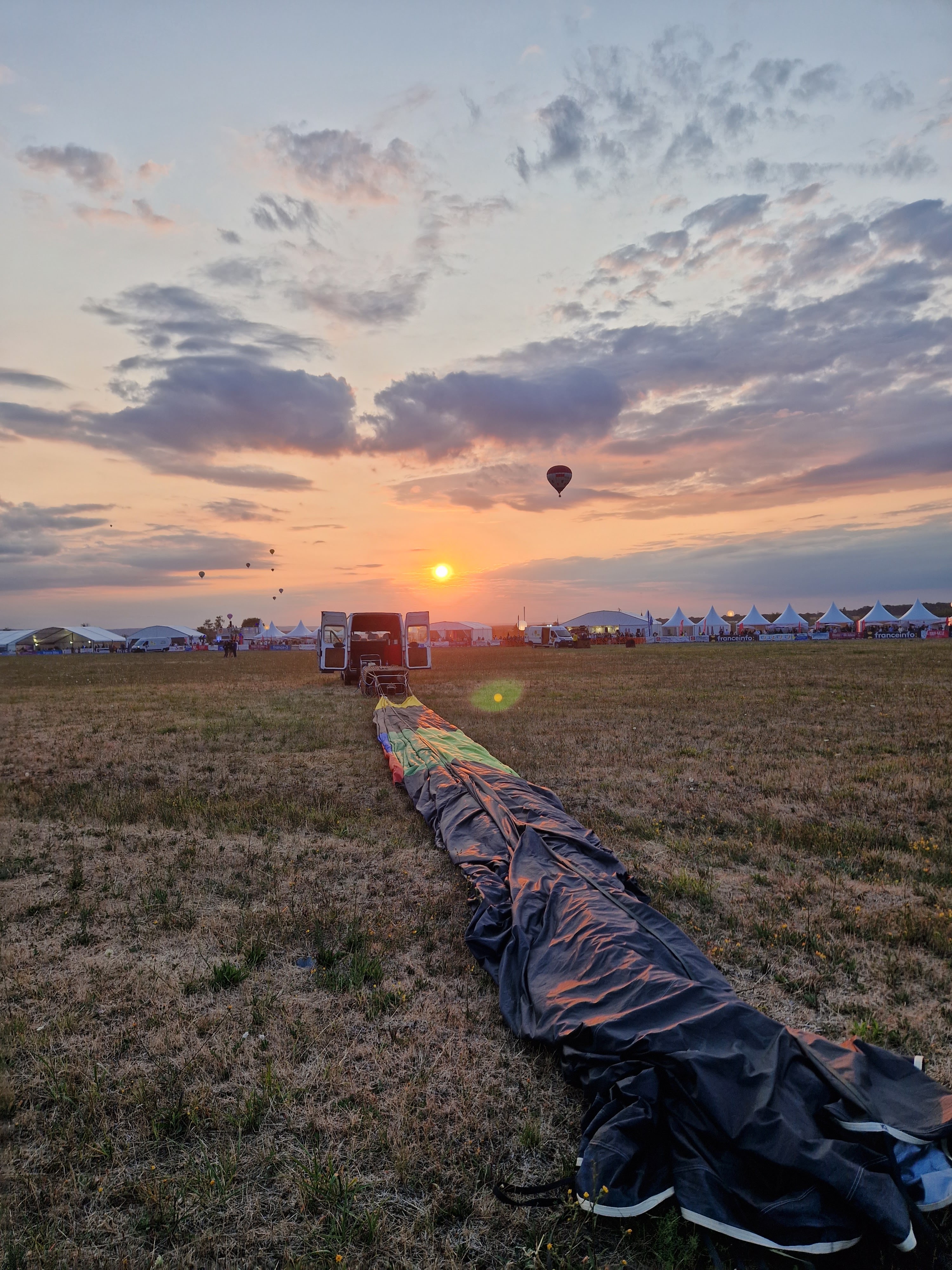 Pour le dernier jour, envol du soir. Je m attendais à voir plus de montgolfières. C est très beau. Parking dans les champs. Visite des hangars possibles pour des expositions.